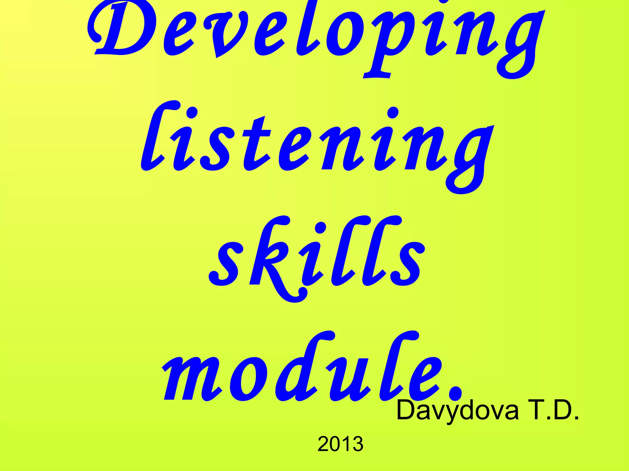 This document outlines a module for developing listening skills. It discusses listening comprehension in real life versus the classroom. It also describes the Russian educational standards for listening which focus on listening for the main idea, details, and specific information. A three-phase framework is presented for teaching listening: pre-listening, while-listening, and post-listening stages. A variety of activities are suggested to practice different listening skills like identifying, choosing, matching, and note-taking. The document stresses that classroom listening training should mimic real-life listening situations.
