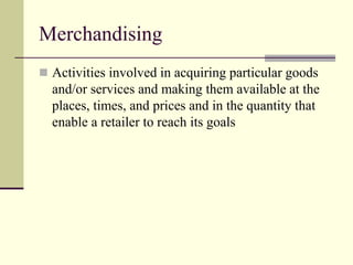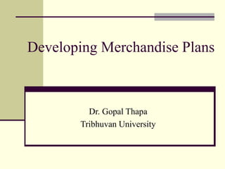 The document discusses developing merchandise plans for retailers. It covers merchandising philosophy, functions, and types of merchandise including staple, assortment, fashion, seasonal, and fad merchandise. Factors to consider in merchandise planning include forecasts, innovativeness, quality, brands, timing, allocation, and category management. Effective merchandise planning requires analyzing sales forecasts, product types, quality factors, branding decisions, timing of purchases and sales, allocating space and inventory, and using category management strategies.
