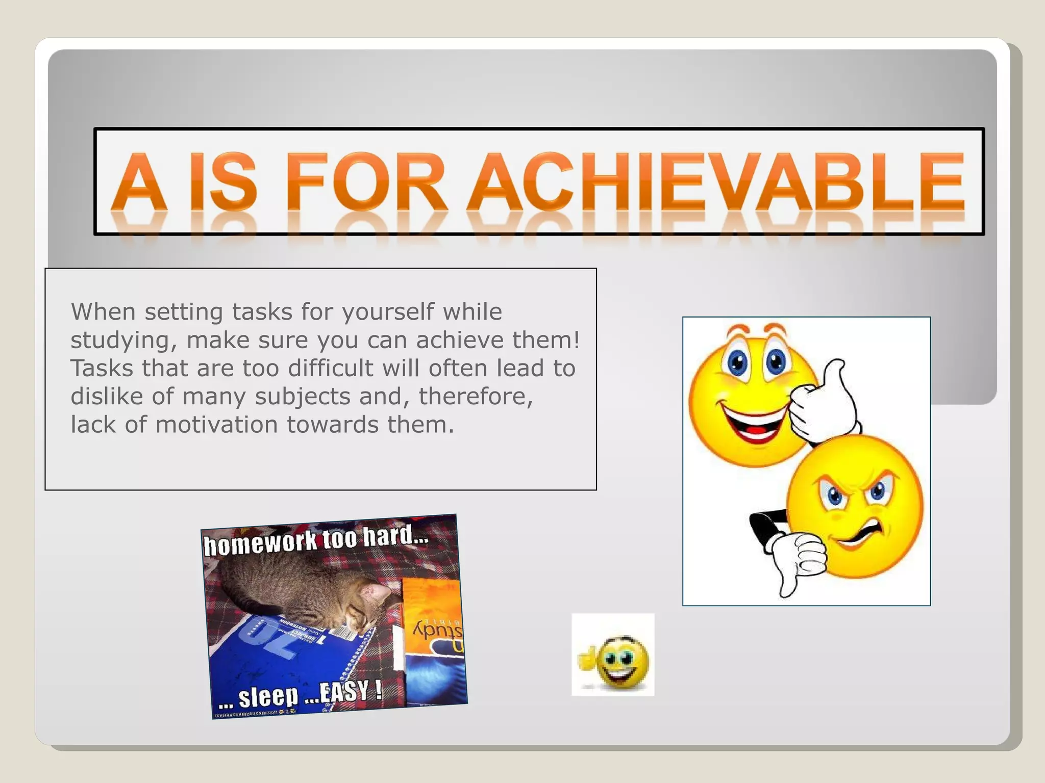 The document provides strategies for developing effective study habits and motivation, emphasizing achievable tasks, regular breaks, and positive environments. It encourages setting goals, managing emotions, and utilizing support from kin and friends, as well as effective study techniques. Additionally, it highlights the importance of maintaining enthusiasm and rewarding oneself to enhance the study experience.