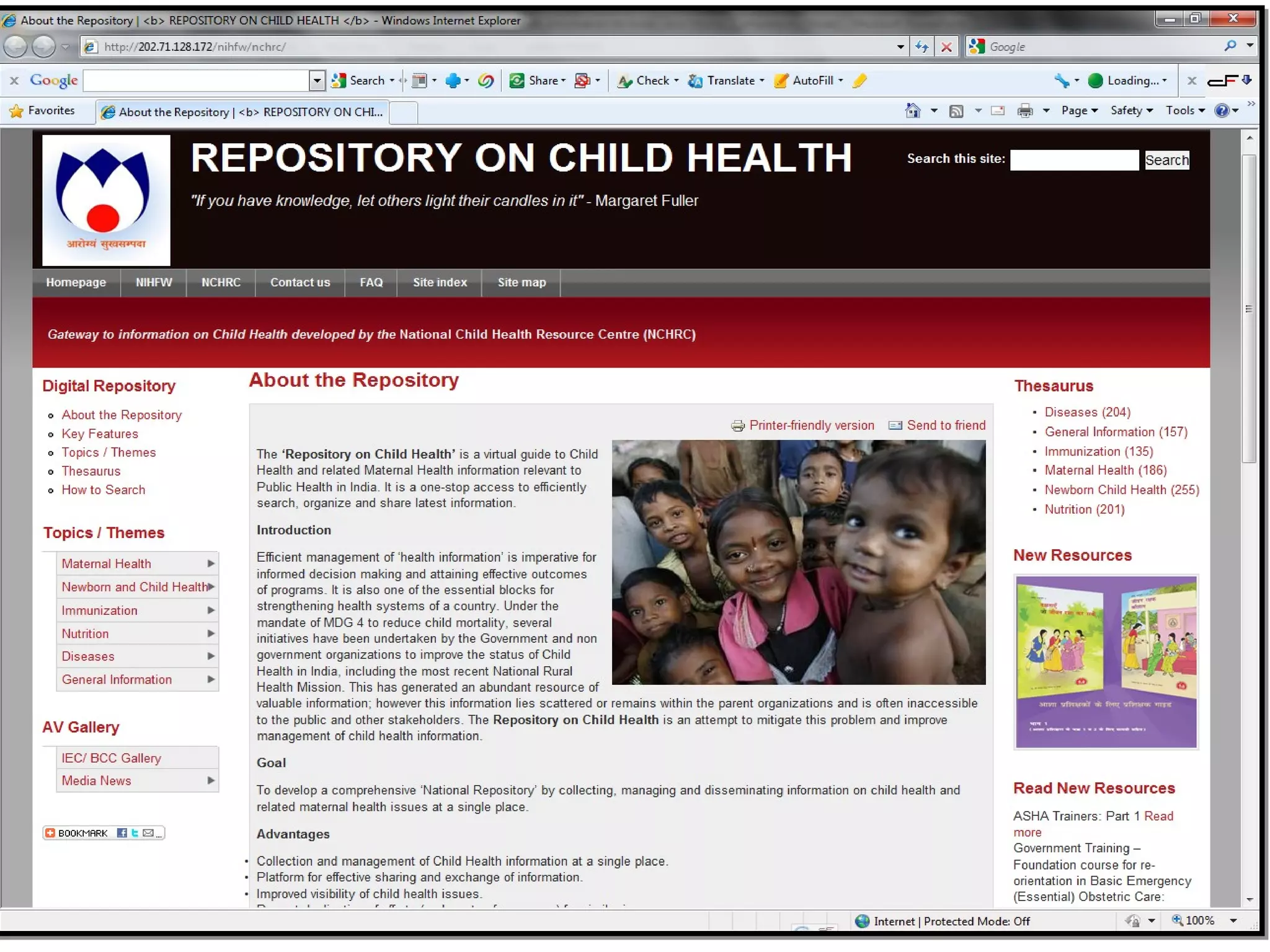The document discusses the establishment of a national repository for child health information in India, aimed at consolidating scattered data to improve public health policies and programs. Launched in July 2010, the repository collects and categorizes resources related to child health and offers free access to over 600 documents. The initiative addresses the poor status of child health in India by providing a platform for information sharing among policymakers, specialists, and frontline workers.