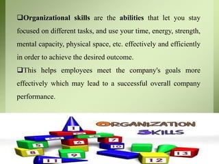 Organizational skills, controlling, supervising, and problem solving are important managerial functions. Controlling involves establishing standards, measuring performance against standards, comparing actual performance to standards, and taking corrective actions when needed. Supervision provides guidance to subordinates and ensures work is done according to plans. Problem solving is crucial for entrepreneurs and involves critical thinking, creativity, initiative, persistence, flexibility, and self-discipline. It also means identifying problems first, staying calm, working from general to specific, adapting, delegating, measuring outcomes, and reflecting.