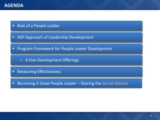 The document discusses American Express' approach to developing people managers. It outlines a tiered curriculum targeting different career stages from aspiring leaders to executive leaders. Various leadership development programs are described, including the Leadership Academy which is a 6-month program to groom future people leaders. The goal is to strengthen leadership skills in areas like coaching, communication, and understanding employees' career aspirations. American Express takes a blended learning approach including workshops, mentoring, assignments and assessments to enhance leadership capabilities across the organization.