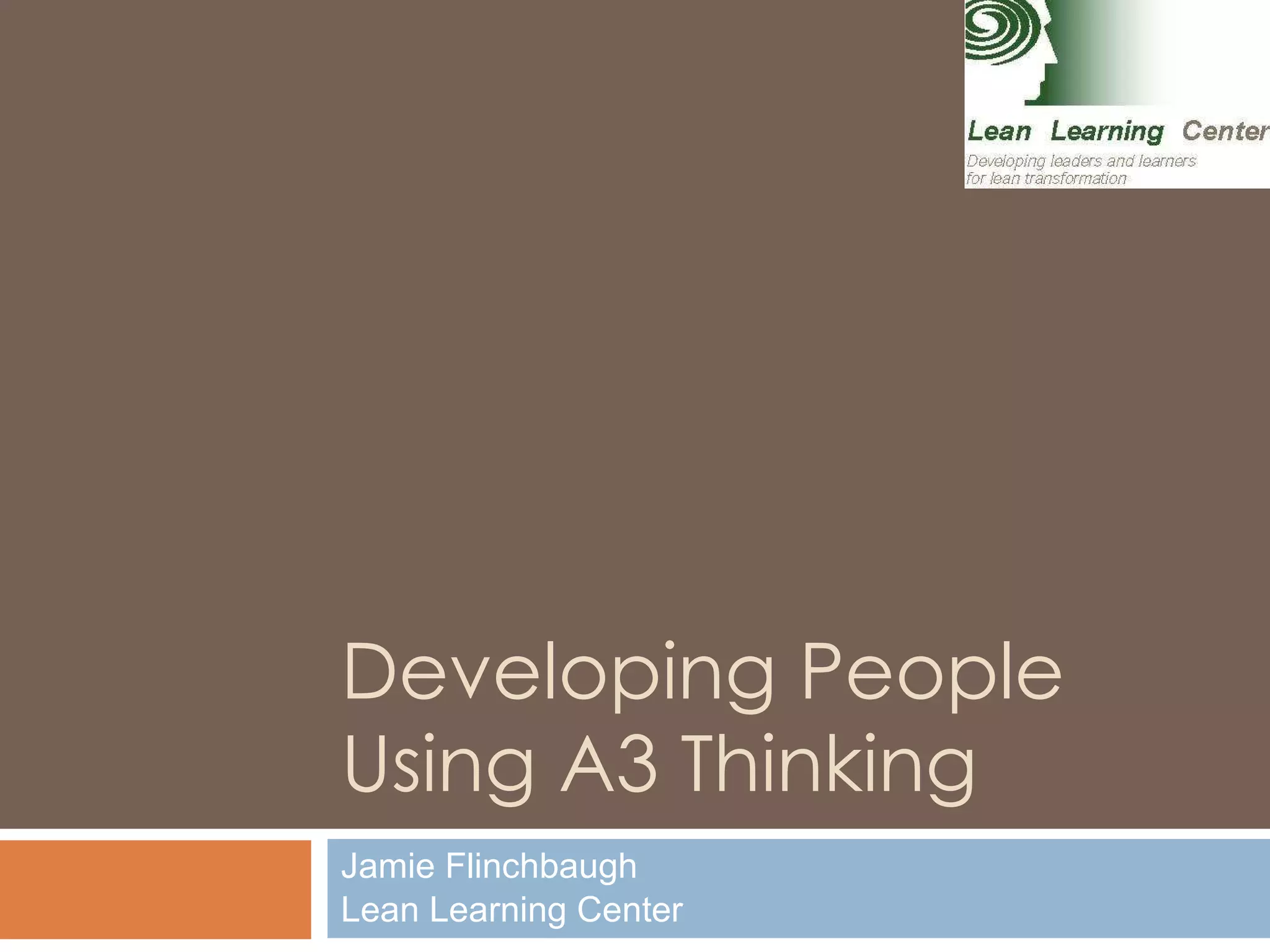 The document introduces the A3 problem-solving method using a single sheet of paper. It explains that A3 thinking structures how problems are captured, communicated, and addressed. The key components of an A3 report are the current condition, target condition, steps to address the problem, and measurements to track progress. The A3 method focuses on visible thinking to close knowledge gaps before performance gaps. It should be used as a learning tool following the PDCA cycle to pursue problems where the solution is not already known.