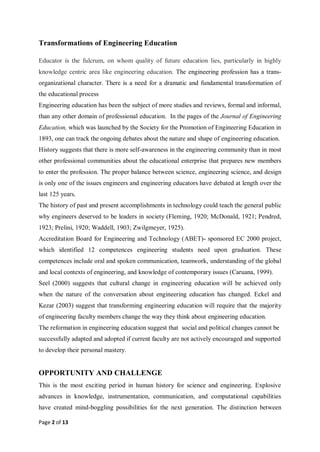 This document discusses the need for engineering educators to develop personal mastery in order to effectively educate future engineers. It identifies nine key characteristics of personal mastery: vision, performance with purpose, high energy, storytelling, fanatic discipline, lifelong learning, trusted relationships, simplicity, and systems thinking. Developing personal mastery is an ongoing process that requires educators to consistently apply these principles on a daily basis through visioning great outcomes, relating lessons to purpose, maintaining high energy, sharing personal stories, prioritizing simplicity, and continual growth and learning. Personal mastery will allow educators to adapt to changes in engineering education and society and prepare students with the necessary skills.