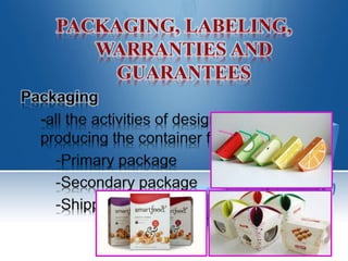 This document defines and categorizes different types of products and aspects of product management. It discusses the core benefit of a product, as well as the basic, expected, augmented, and potential products. It also defines consumer goods, shopping goods, specialty goods, unsought goods, and different types of industrial goods. The document outlines factors for differentiating products such as form, features, customization, quality, reliability, and design. It also discusses packaging, labeling, warranties, and managing product lines and mixes.