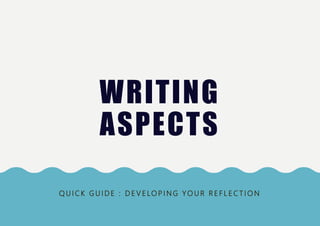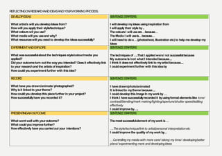 This document provides guidance on developing reflections for creative works. It includes prompts to help the reader reflect on developing ideas from artistic inspiration, experimenting with techniques and media, recording creative outcomes, and analyzing the works of others. The prompts cover exploring subjects, formal elements like color and texture, creative processes, and interpreting moods and meanings. Word banks with descriptive terms are also included to aid written reflections.