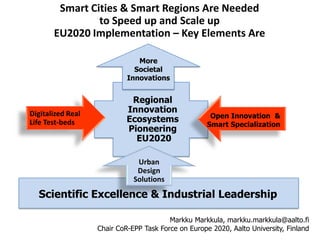 The document discusses the development of regional innovation ecosystems through strategies such as RIS3 and Horizon 2020, emphasizing the importance of societal impact, user-driven development, and synergy between different funding sources. It outlines the challenges and steps involved in implementing smart specialization strategies, targeting innovation leaders and those lagging behind. Additionally, it highlights the collaborative efforts in the Helsinki region and other areas to foster sustainable innovation through education, research, and stakeholder engagement.