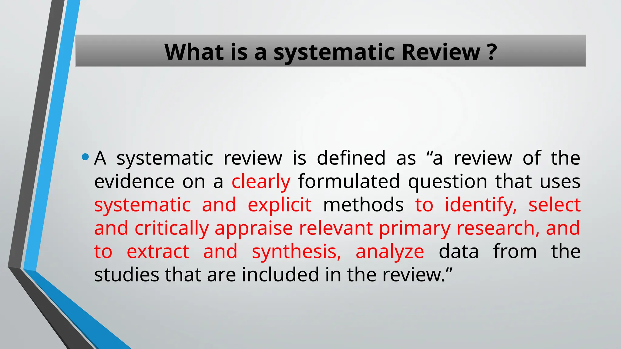 This document outlines the development of a systematic review, defining it as a structured analysis of evidence pertaining to a specific research question. It emphasizes the reasons for conducting systematic reviews, including supporting evidence-based practice and informing clinical policy, while detailing stages such as formulating research questions and evaluating study design. The document also provides guidance on creating a research strategy, identifying data sources, and assessing methodological quality.