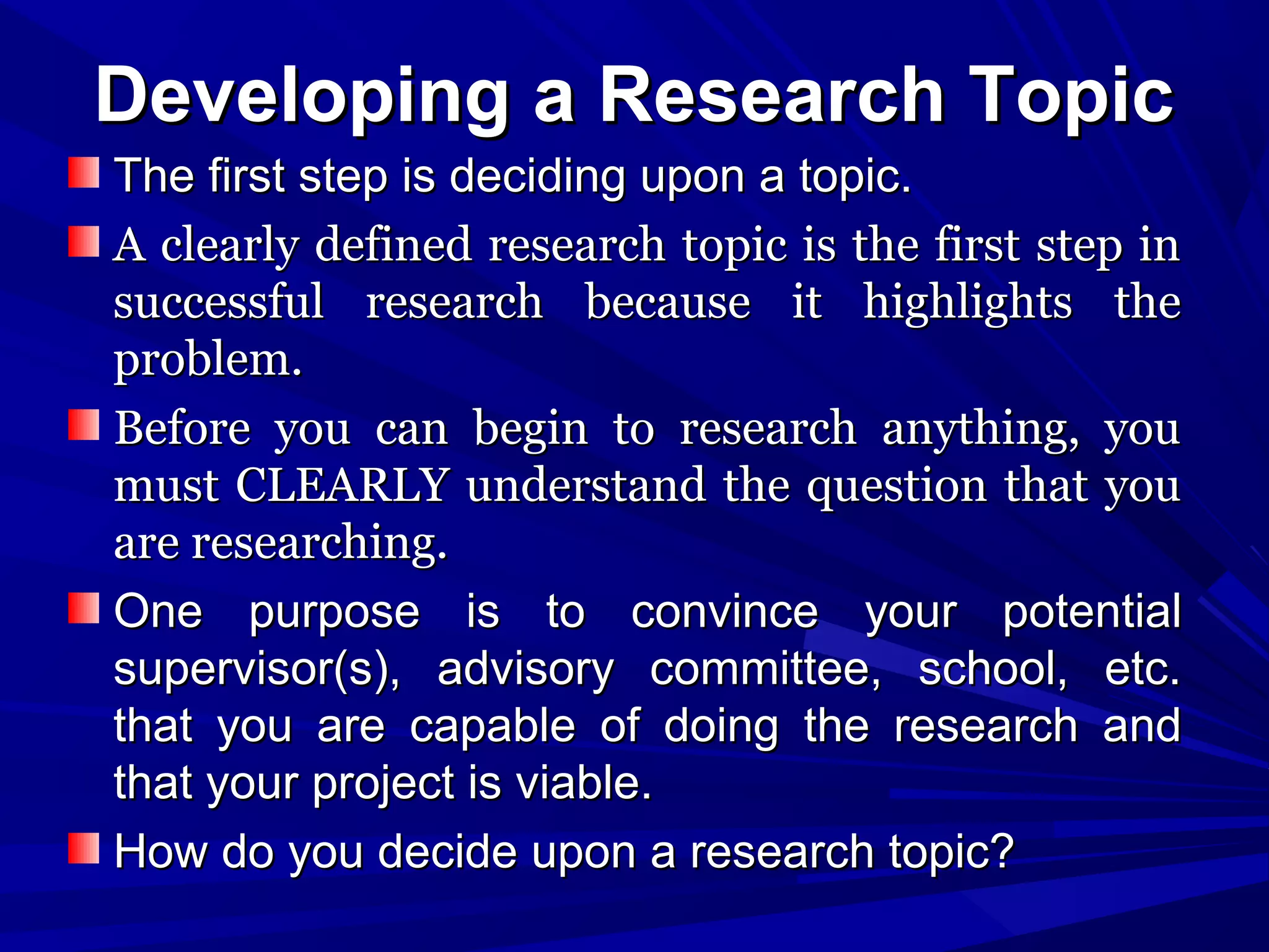 This document provides an overview of developing a research topic and proposal. It discusses determining a clearly defined research topic that highlights a problem. Important considerations for a research topic include being of interest, significant, researchable, feasible, practical, and focused. A theoretical or conceptual framework related to the topic should be developed. The proposal should convince reviewers that the project is viable. Key elements of a research proposal are discussed such as the problem statement, objectives, methodology, scope, rationale, and limitations. Guidelines are provided for formatting the research topic, proposal, and report.