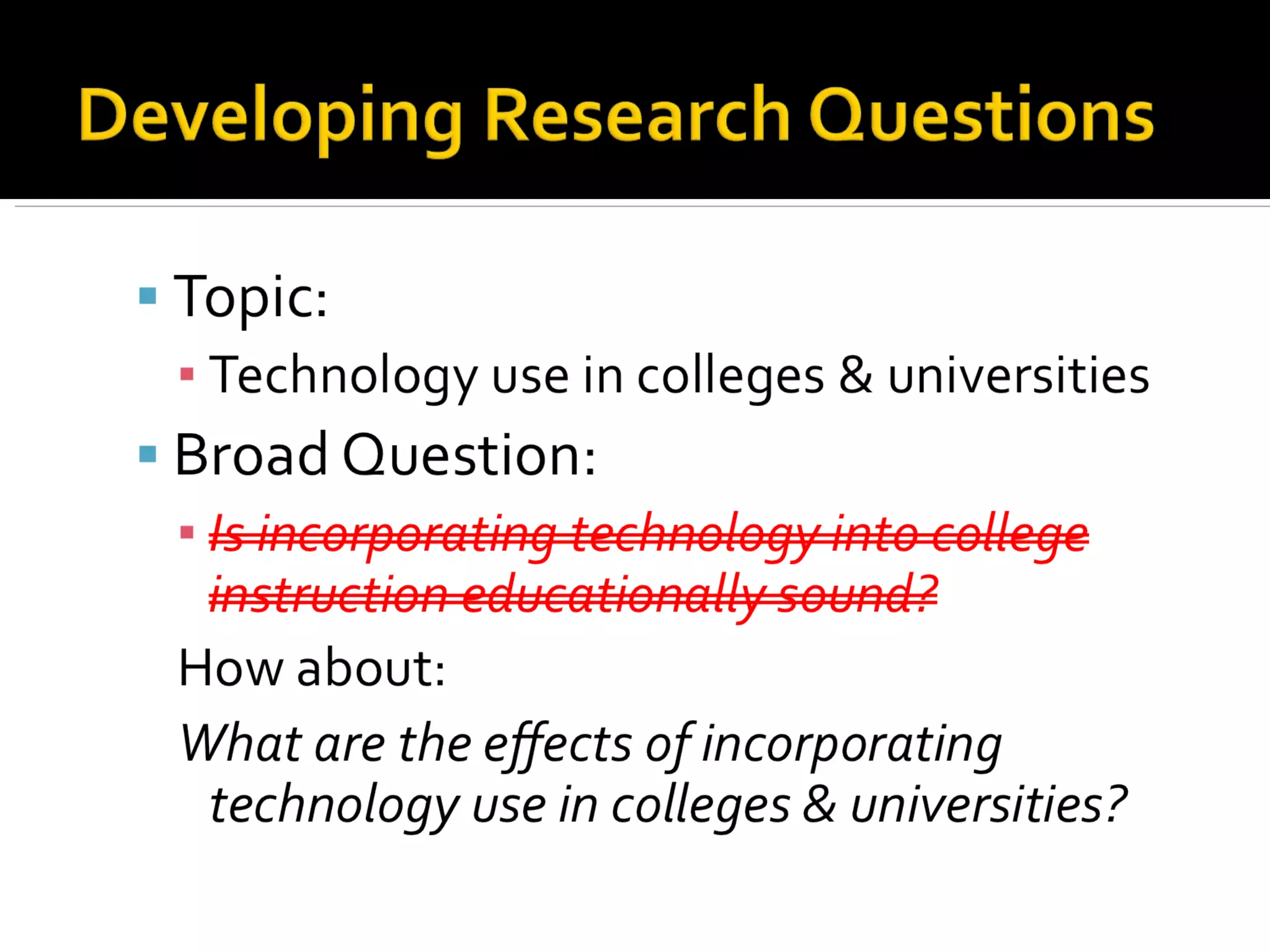 The document provides guidance for writing a graduate paper on the topic of technology use in colleges and universities. It suggests making the topic more specific and developing sub-questions to address the main research question. Keywords are identified from the questions and searched individually and in combinations on Google Scholar to find relevant articles. Other research resources mentioned include the university library catalog and databases, as well as interviews and online sources.