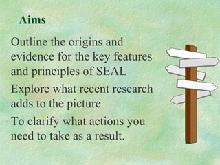 This document discusses the evidence behind social and emotional learning (SEL) programs in schools. It outlines that SEL programs are most effective when they take a whole-school approach, focus on developing relationships and participation, and provide clarity and autonomy. Recent research shows that well-designed SEL interventions can positively impact students' social/emotional skills, behavior, and academic achievement, as well as teacher retention and performance. Key ingredients of successful programs include sound theory, a supportive school environment, skill development, parental partnerships, high-quality implementation, and monitoring/evaluation.
