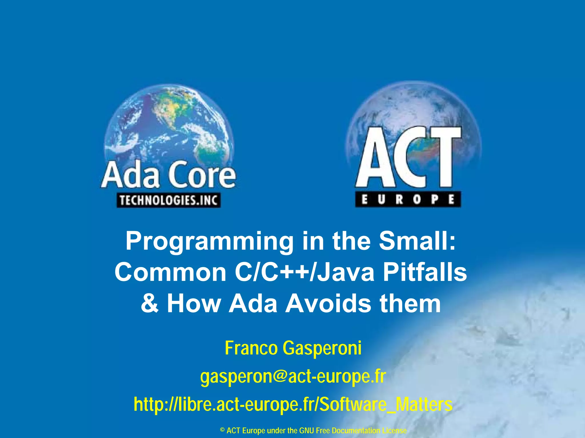 The document discusses common pitfalls in C, C++, and Java programming, particularly in small-scale programming, and contrasts them with how Ada avoids these issues. It emphasizes the assumptions made by C-based languages that can lead to software fragility and highlights the importance of programming consistency, which Ada enforces through its design. Additional resources and relevant literature on programming practices and pitfalls are also provided within the document.