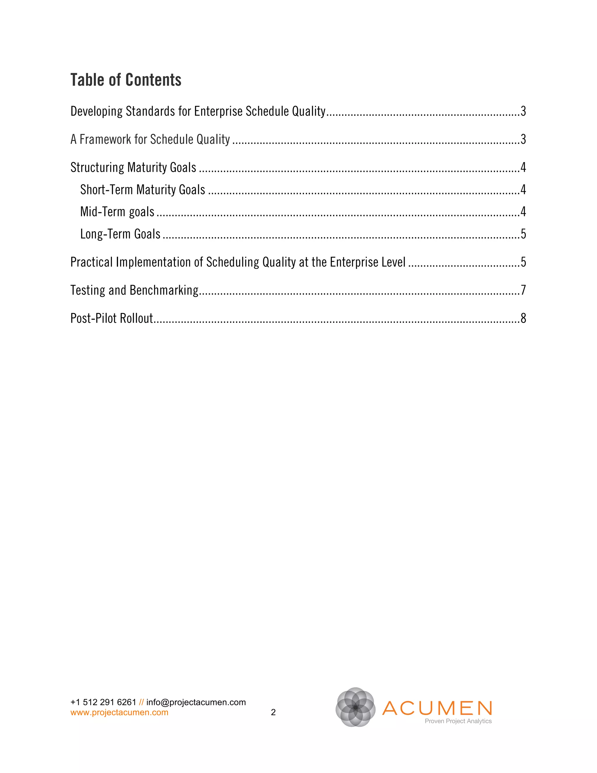 The document outlines the importance of developing quality standards for enterprise project schedules, emphasizing that high schedule quality is crucial for successful project execution. It introduces a framework for improving schedule quality, detailing a five-stage maturity process, and suggests practical goals for short, mid, and long-term maturity improvements. Additionally, it highlights the need for continuous quality improvement across all project stakeholders and provides guidelines for implementing and benchmarking quality metrics.