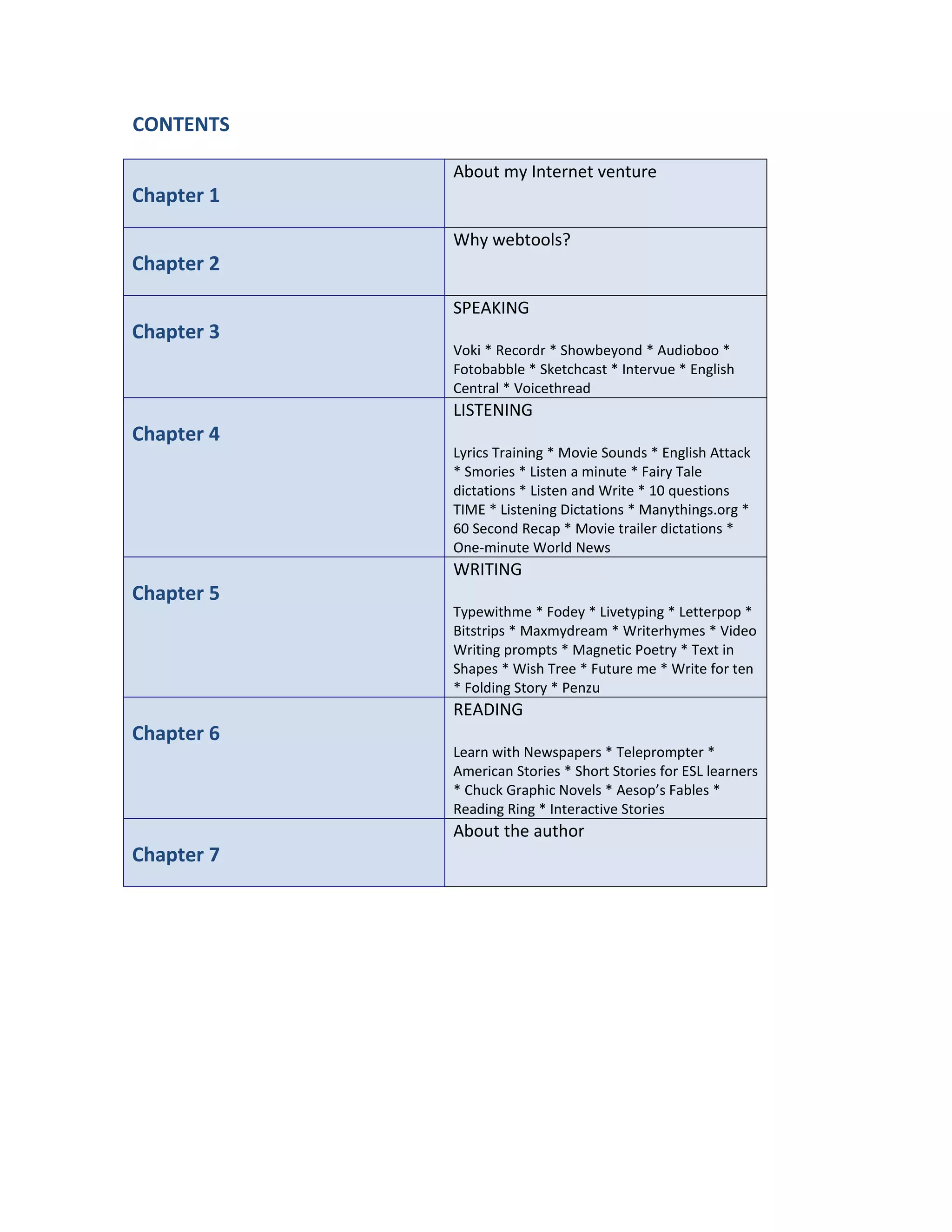 The document provides suggestions for using webtools to develop language learners' four skills: speaking, listening, reading, and writing. It discusses how today's students learn differently compared to past generations and are more accustomed to learning through online resources. The document then lists and describes several free webtools for each of the four skills, and provides example activities for how teachers can assign them. These include tools like Voki, Recordr, Showbeyond, Audioboo, and Sketchcast for speaking practice, and tools for listening, writing, and reading activities.