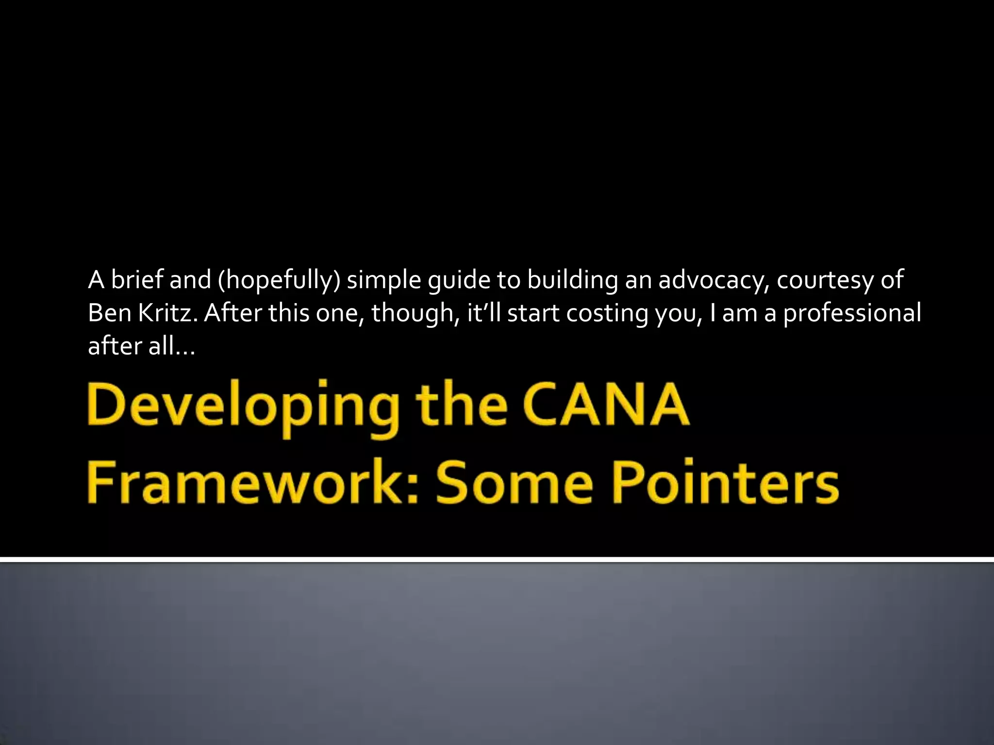 This document provides guidance on building an advocacy for better service delivery by the government to people. It recommends working backwards from the goal and ensuring the objective is clear. It also suggests using the "5 Whys" technique to investigate the root causes of any problem or desired outcome. The root causes identified were improved government transparency/accountability, productive citizen-government engagement, agents working on behalf of all people, and use of communication technologies to connect citizens with government information and vice versa. It outlines two key processes - engaging citizens through education/information and feedback, and engaging government through the same. The overall task is described as communication between citizens and government to keep both informed.