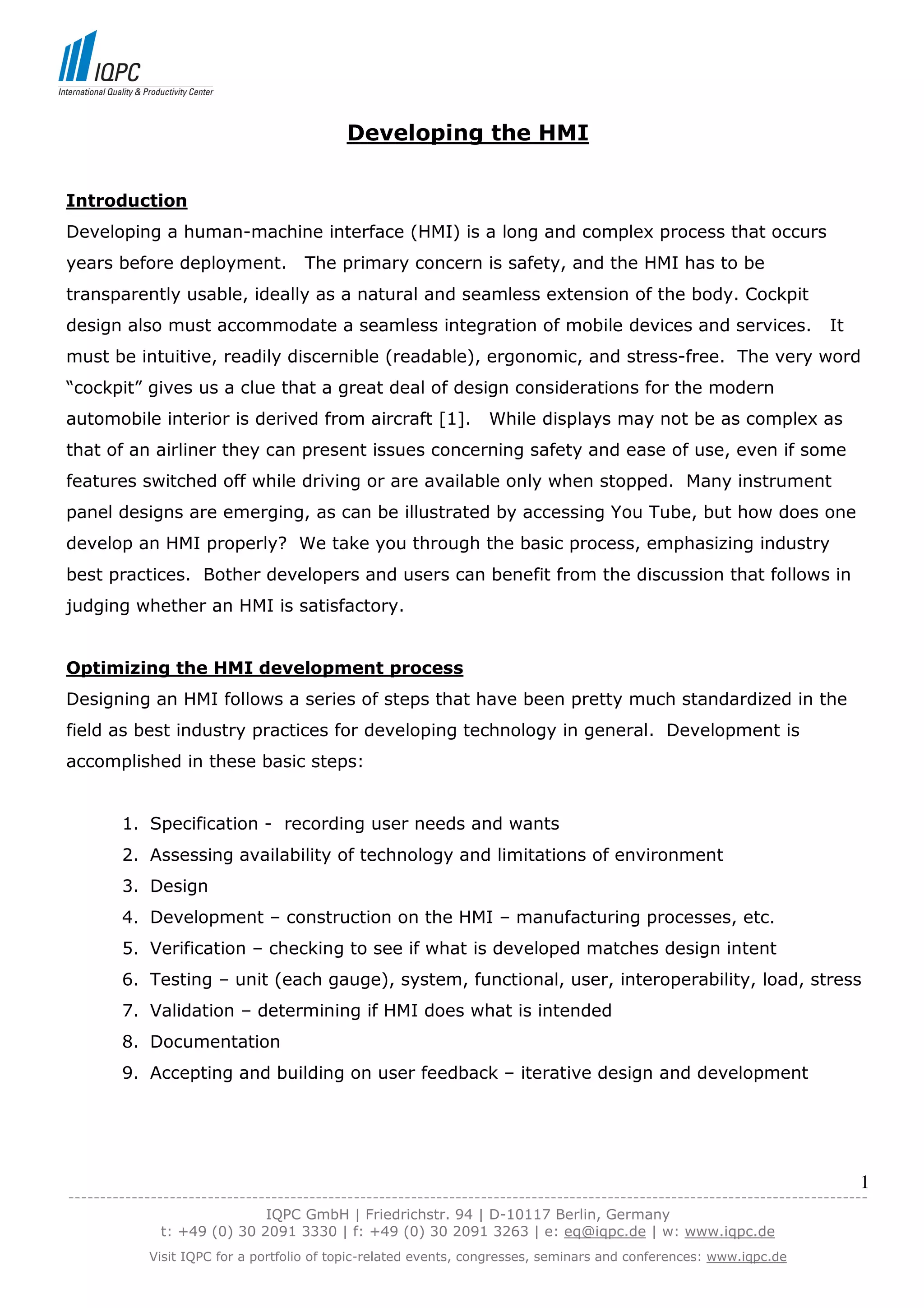This document outlines the comprehensive process of developing a human-machine interface (HMI) for vehicles, emphasizing safety, usability, and intuitive design. It details the standardized steps in HMI development, including user need assessments, design, verification, and validation while highlighting the importance of user feedback and iterative improvements. Additionally, it provides guidelines for effective information presentation and testing, ensuring that the HMI meets both safety standards and user expectations.