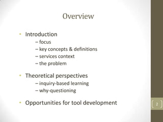 This document discusses developing tools to facilitate integrated reflection. It provides an overview of key concepts like e-portfolios, reflection, and reflective practice. It discusses the need for tools that better support reflection, which is recognized as important for learning but tools currently offer little beyond basic journal templates. Opportunities exist to develop new tools using techniques like question generation and answering to better scaffold learning through inquiry and reflection.