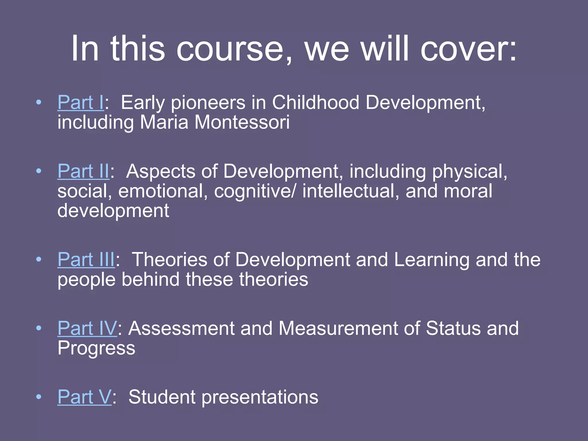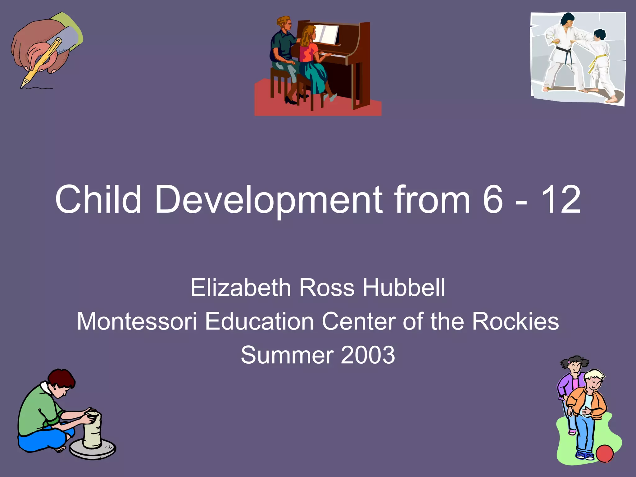 The document provides an overview of a course on child development from ages 6 to 12. It covers early pioneers in childhood development such as Maria Montessori and Jean Piaget. It also discusses theories of development from thinkers like Erik Erikson and aspects of development including physical, social, emotional, cognitive, and moral development during this stage. Theories of learning from psychologists like Pavlov, Skinner, and Vygotsky are also summarized.