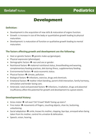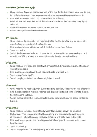 This document outlines typical developmental milestones for infants and children from birth through age 5. It discusses the progression of gross motor, fine motor, speech, and social/emotional skills. Key milestones include head control at 4 months, sitting without support at 8 months, walking by 12-18 months, and copying shapes by age 4 when children are ready for school. The document also reviews teeth development and general notes on developmental norms and flags for potential problems.