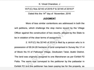 The document discusses land encroachment issues in Munnar, Kerala. It describes how various government reports and a high court ruling found widespread illegal encroachment on forest and government lands through unauthorized construction and commercial activities. While some see encroachers as settlers, others want stern action. Proposed solutions include a separate development authority and long-term planning for Munnar that protects the environment. A sub-collector took action against violators but faced resistance from politicians protecting encroachers. The document questions why responsible Kerala governments over 50+ years have done little to prevent the practice of encroachment.