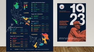 1. Pres. Duterte's Sambayanihan program aims to reduce poverty through public-private partnerships, local-national cooperation, and peace efforts to allow development in conflict areas. Key targets include lowering poverty incidence to 14% by 2022 and implementing the 2017-2022 Philippine Development Plan.