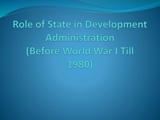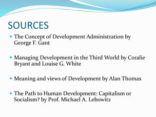 Development administration emerged in the 1960s to help implement policies and plans for nation-building and socio-economic progress in developing countries. It aims to strengthen administrative machinery to facilitate defined programs of social and economic progress by making change attractive to populations. Key elements include planned and coordinated efforts, a goal-oriented and people-centered approach, and creating management capacities. Problems include a lack of experienced administrators and modern techniques as well as procedural delays and poor implementation. The nature of development has changed from a 19th century focus on individualism and economic growth to a post-WWII emphasis on state-led development and goals like poverty reduction, self-reliance, and resource mobilization.