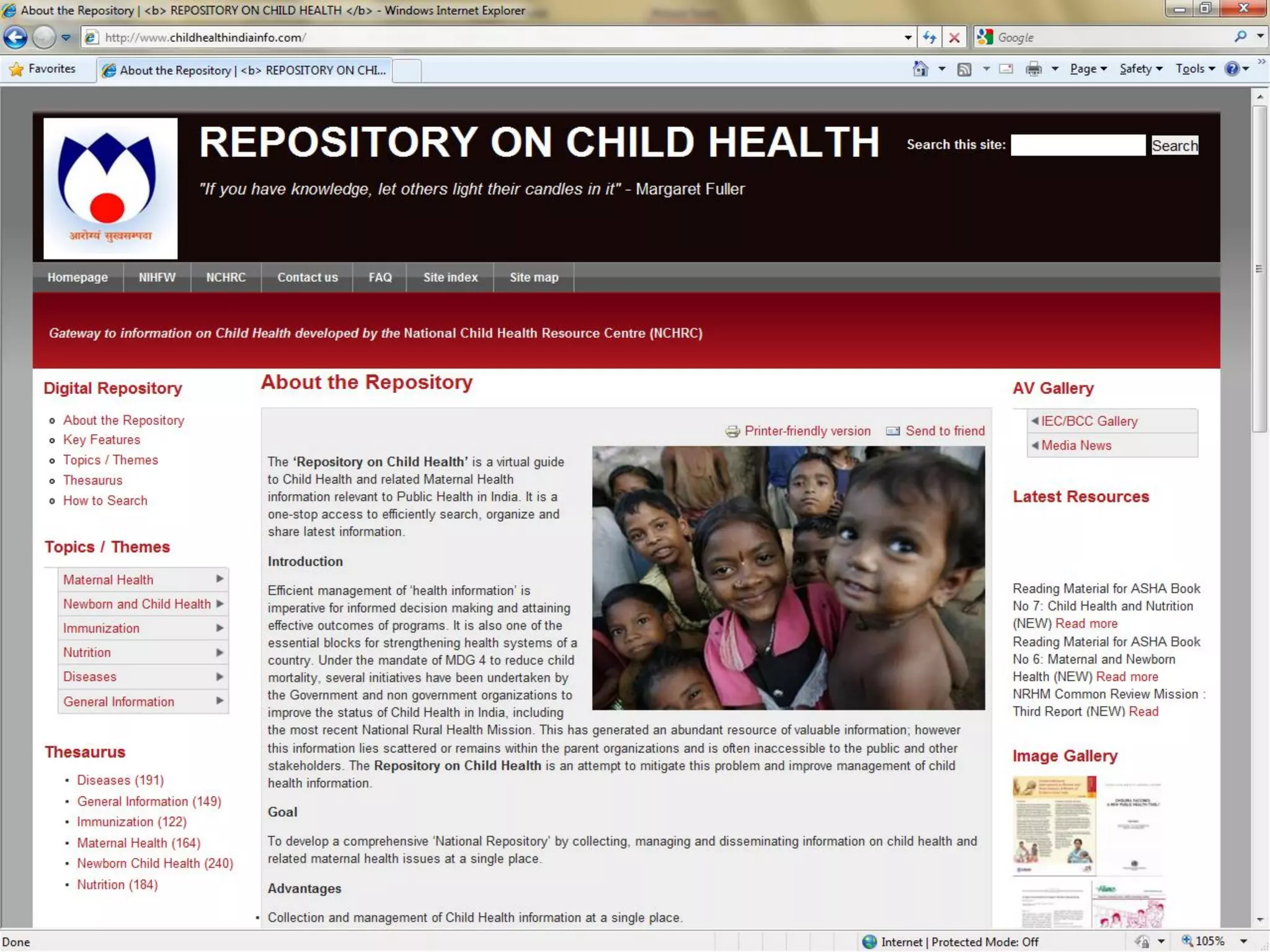 The document discusses the need for a centralized digital repository for child health information in India, highlighting the current lack of coherence, authenticity, and accessibility of existing health repositories. It introduces the National Child Health Resource Centre (NCHRC) established to create a comprehensive repository that aggregates and disseminates child and maternal health information effectively. The plan includes collaboration with various national and international organizations to collect and manage relevant data, aiming to support policymakers and health professionals with accessible and reliable resources.