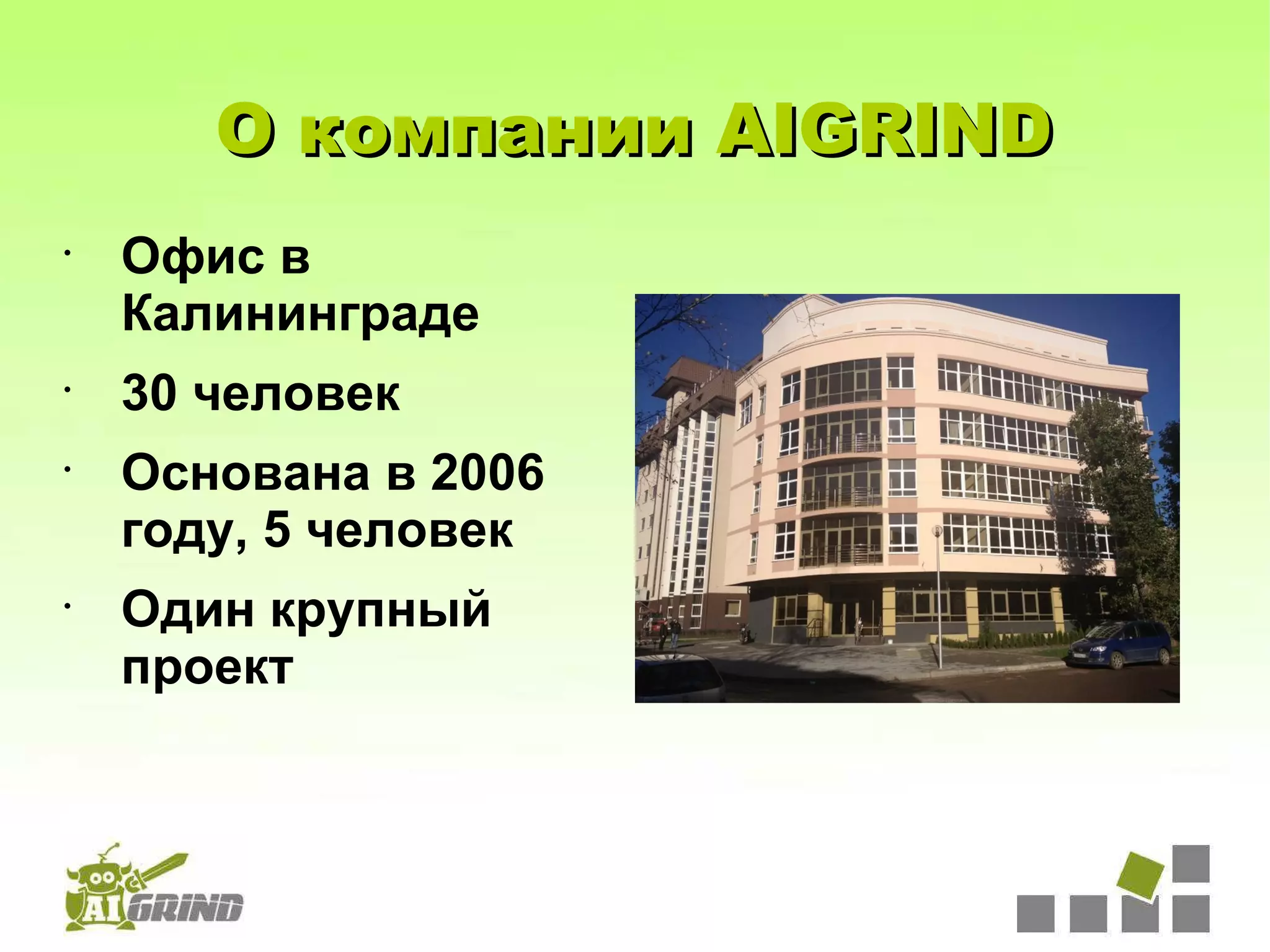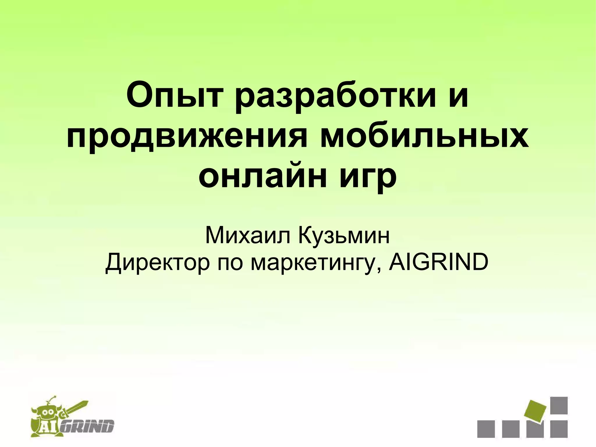 Документ содержит информацию о компании Aigrind, специализирующейся на разработке мобильных онлайн-игр, включая успешный проект Warspear Online. Основное внимание уделяется принципам модели free-to-play, привлечению пользователей и монетизации через различные каналы. Также рассматриваются рекомендации по работе с сообществом и особенностям локальных рынков.