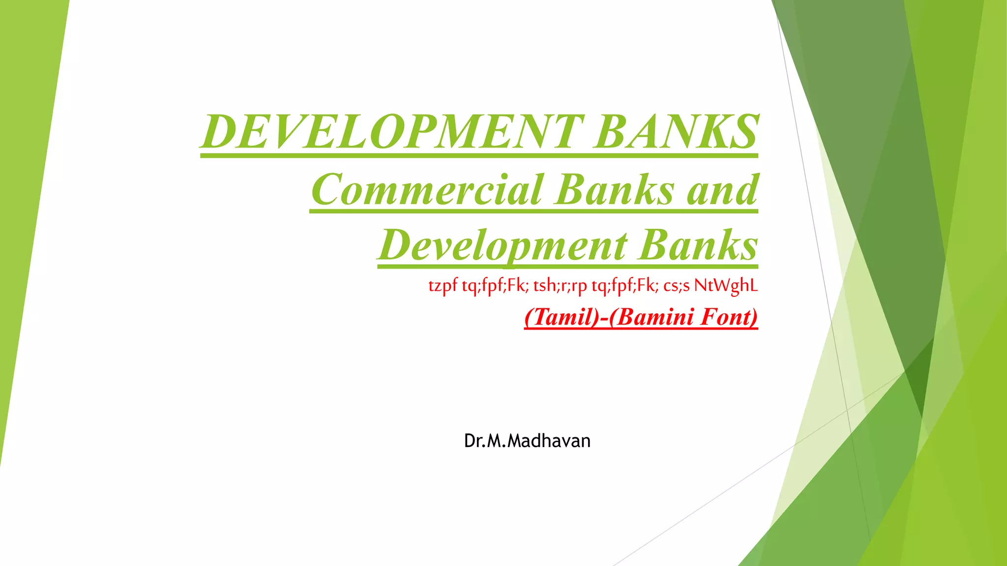 This document discusses and compares commercial banks and development banks. It provides details about the key differences between them.
