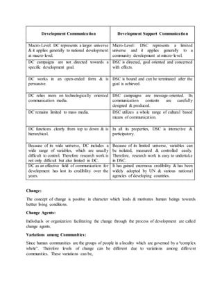 Development communication involves the strategic use of communication to promote socially beneficial goals. It represents communication at a macro level to facilitate national development, while development support communication applies at a micro level to specific community development programs. Key aspects of development communication include using opinion leaders and various communication channels to raise awareness and influence attitudes in support of development initiatives, while also addressing factors like culture, education, and participation that can influence change. Planning development communication campaigns involves understanding cognitive, emotional and behavioral aspects as well as techniques like persuasion and addressing potential resistance to change.