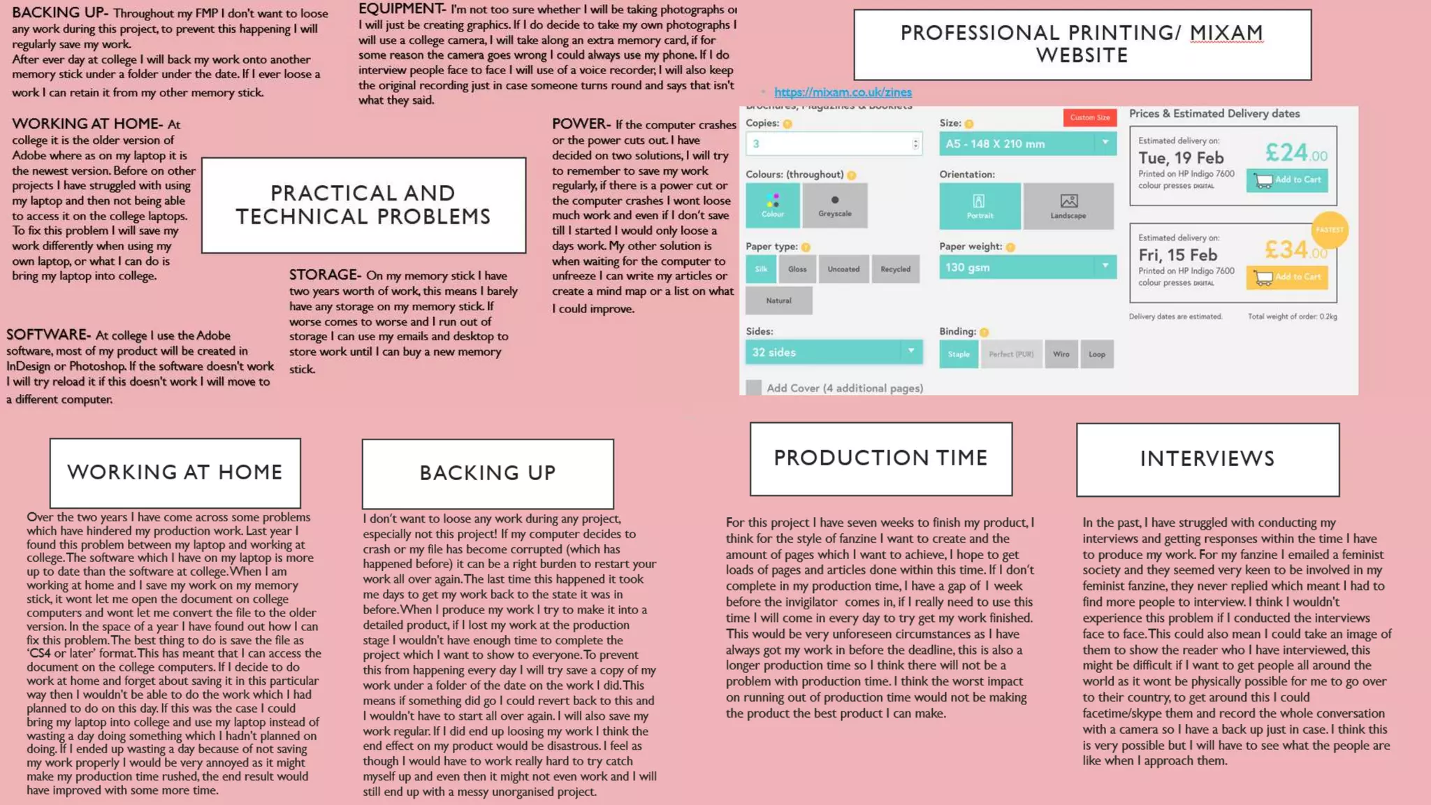 This document provides a weekly development diary for a student's final major project creating a feminist fanzine. Over the course of 7 weeks, the student focuses on research, planning, and experiments to prepare for production of the fanzine. In week 1, the student prioritizes initial context and proposal work and identifies areas for further research. Weeks 2-3 involve in-depth analysis of existing feminist magazines and fanzines as well as beginning audience research. Week 4 consists of production experiments. Weeks 5-6 are dedicated to planning, including pagination, style sheets, interviews, and copy writing. Week 7 focuses on completing final planning tasks, with production to begin the following week.
