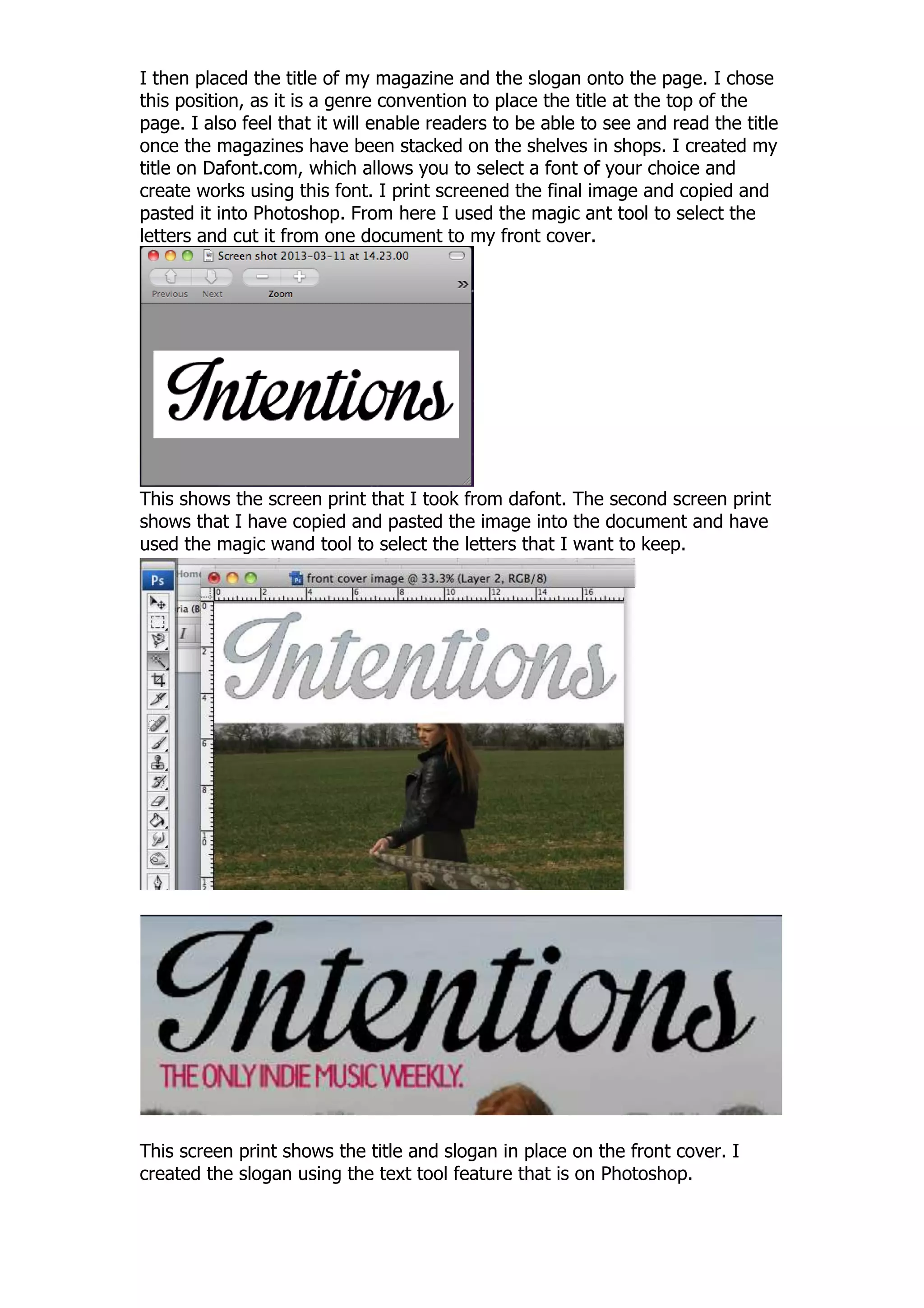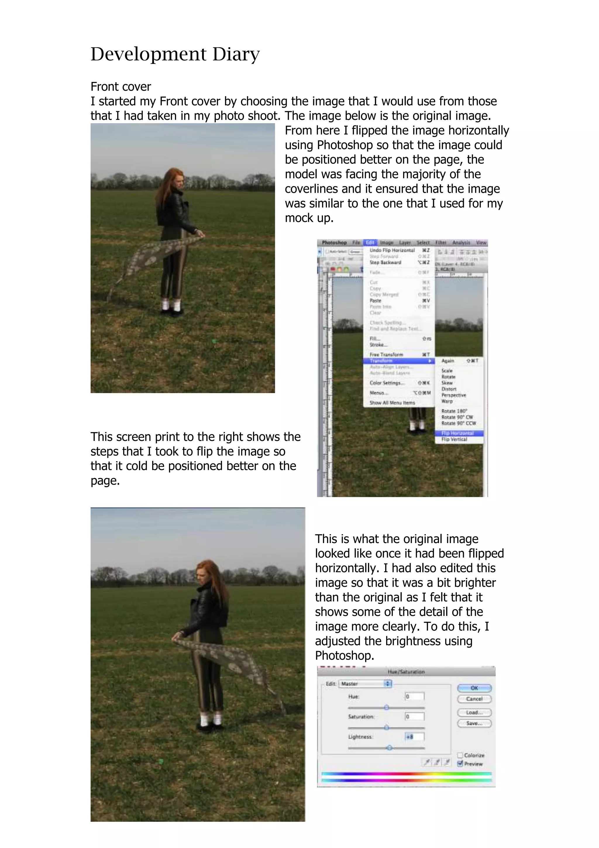 The document provides details on the development of a magazine front cover and contents page. For the front cover, the creator flipped an image horizontally, adjusted its brightness, and added the magazine title and coverlines in different colors. They also included the barcode, price, and issue details. For the contents page, they formatted the listings and descriptors, added images and a pink box for the editor's note. They finalized both pages by continuing branding elements and ensuring readability.