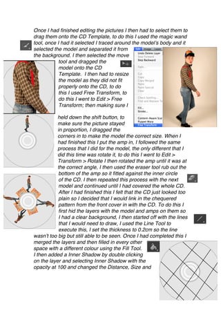 1) Opening templates and images to add models jumping over amps on the CD. Pictures were edited and elements dragged onto the template and resized.