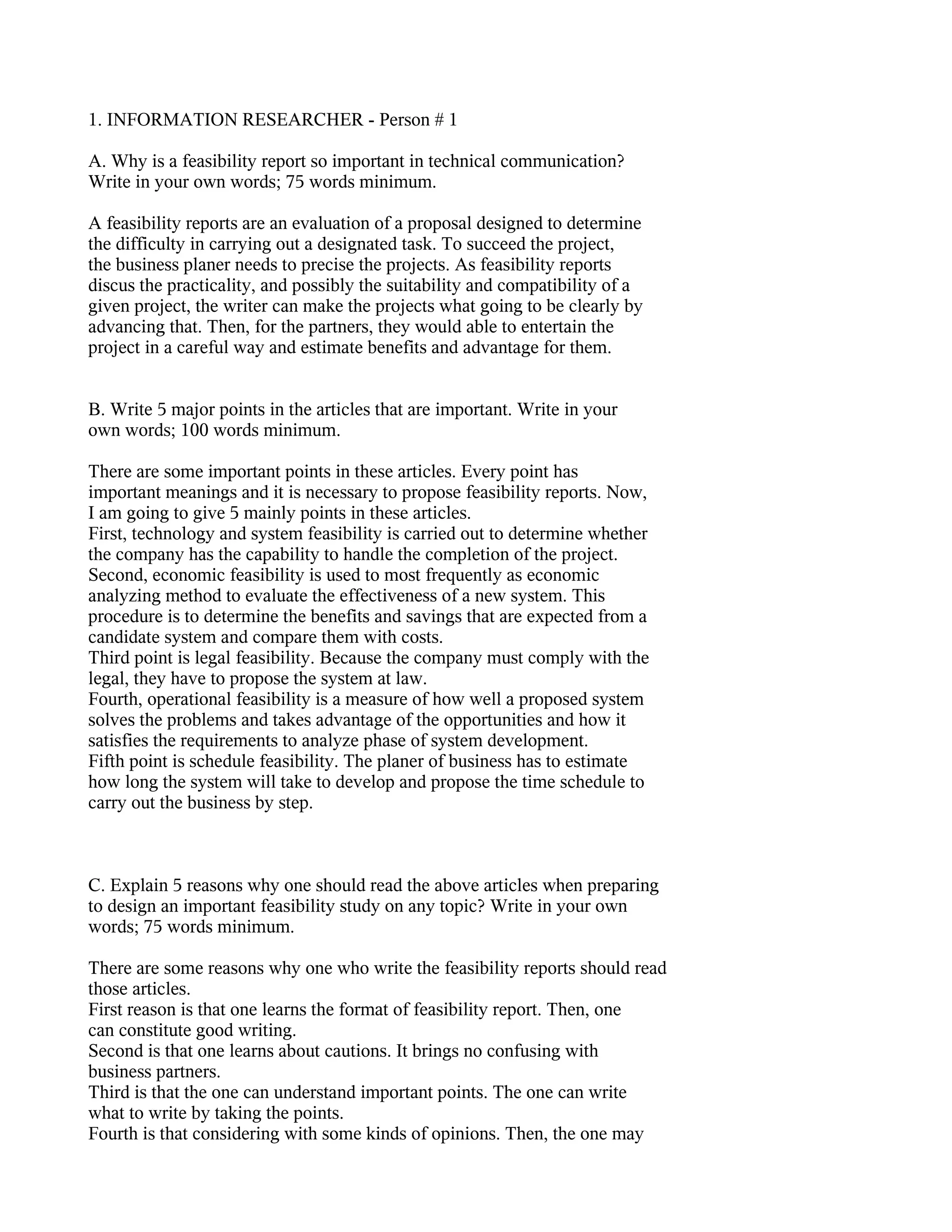 2. Important points in the articles include assessing a company's capability to complete a project, evaluating economic benefits and costs, ensuring legal compliance, analyzing how well a system solves problems, and estimating development timelines.