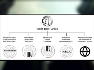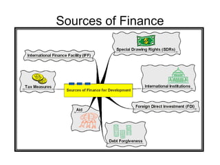 This document discusses various sources and approaches to financing development. It describes financing from international institutions like the IMF and World Bank which provide loans, grants and other funding. It also discusses domestic resource mobilization through taxes and spending by national governments. Private sector financing approaches include blended finance which blends public and private funds, as well as philanthropic funding. Challenges to development financing include situations of conflict and fragility. Innovative financing solutions and partnerships are needed to help address development needs in these difficult contexts.