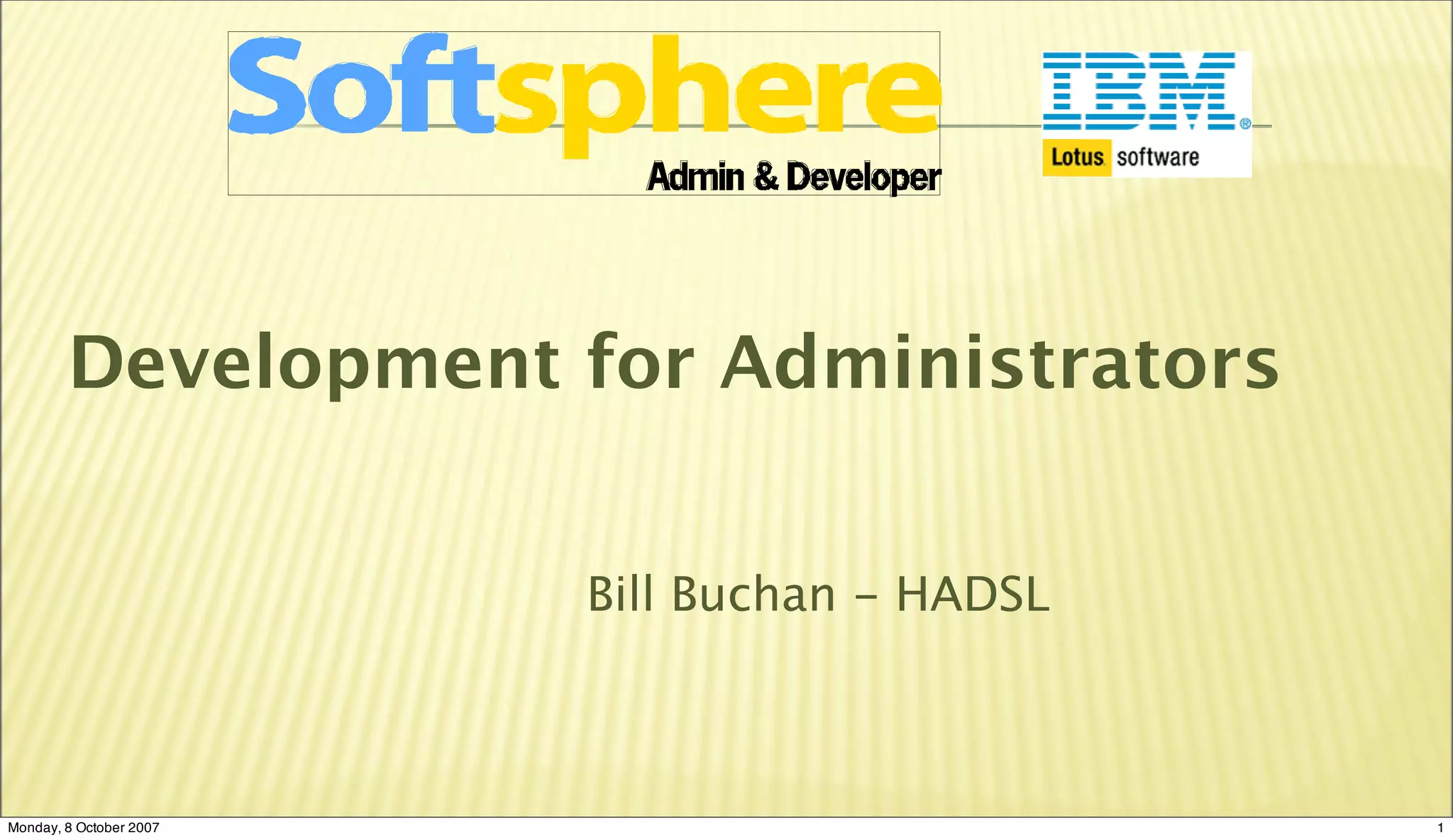 This document provides guidance for administrators on development practices for applications in Lotus Notes/Domino. It discusses setting up separate development, test, and production environments to allow for proper change control and testing. It also covers deploying applications between these environments, including the use of release notes and a signing agent. The document then provides a brief introduction to @Formula and LotusScript for simple agents.