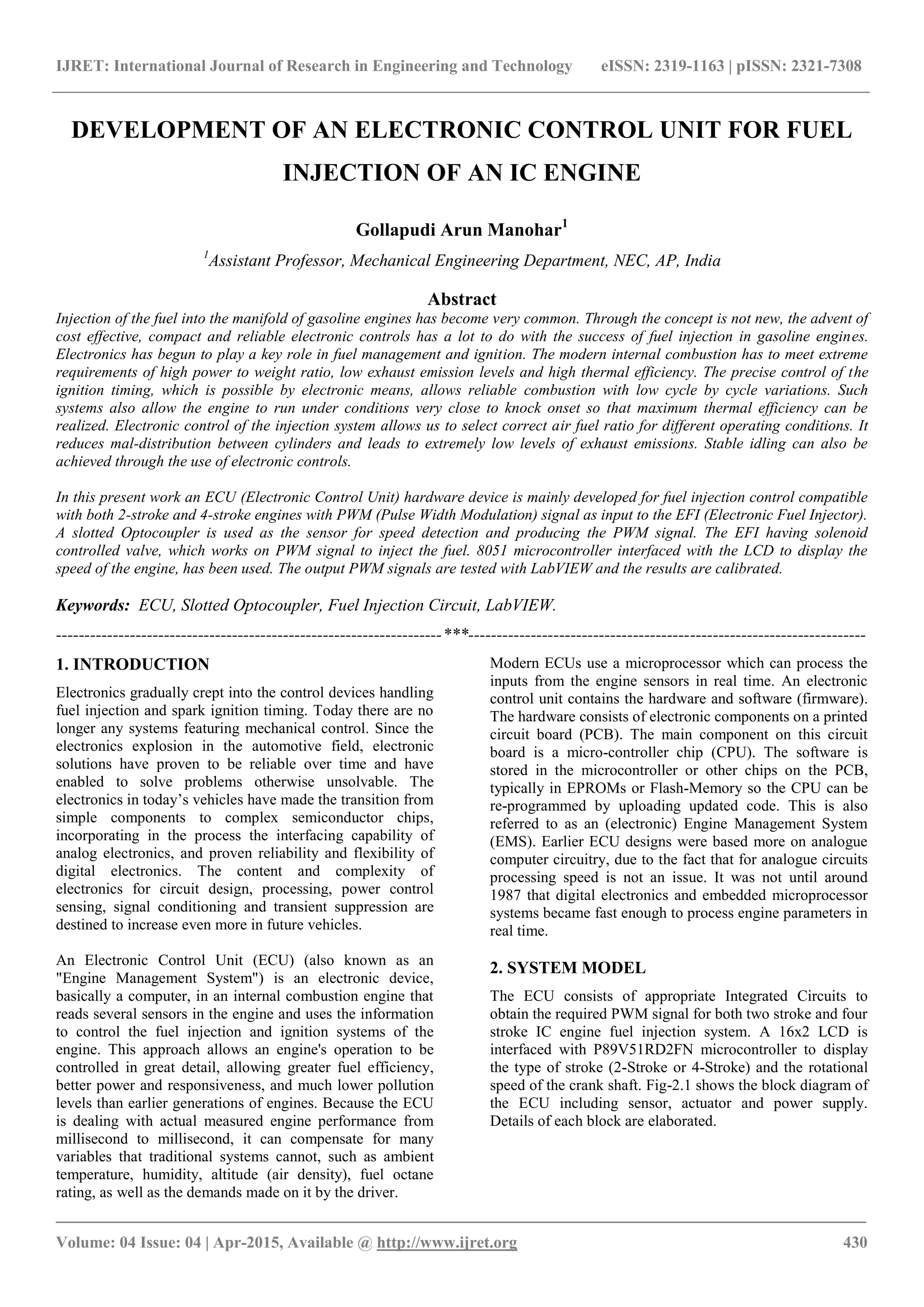 This document discusses the development of an electronic control unit (ECU) for fuel injection control compatible with both 2-stroke and 4-stroke internal combustion engines. It highlights the role of electronics in enhancing fuel management and ignition timing, allowing for improved fuel efficiency, lower emissions, and reliable operation under various conditions. The ECU design incorporates a microcontroller, sensors, and other electronic components to accurately manage fuel injection based on engine performance metrics.