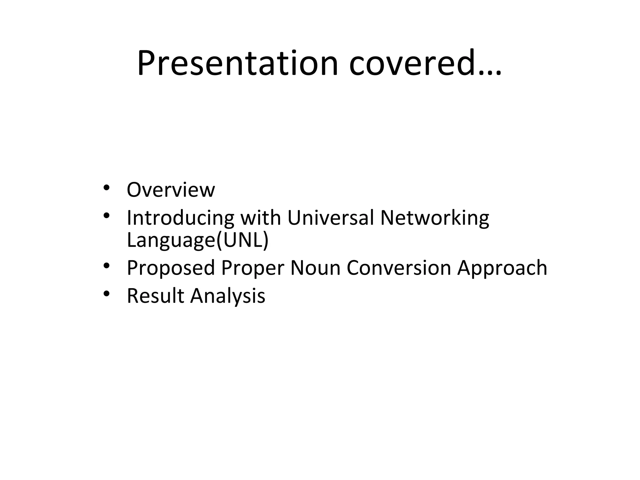 The document discusses the development of analysis rules for identifying proper nouns in Bengali sentences as part of the Universal Networking Language (UNL) project, which aims to facilitate communication across languages. It outlines the challenges of proper noun detection in Bengali due to its lack of capitalization and introduces methods including dictionary-based and rule-based approaches for proper noun conversion into UNL. The paper describes the components of the UNL system and emphasizes the importance of creating a multilingual platform for knowledge sharing.