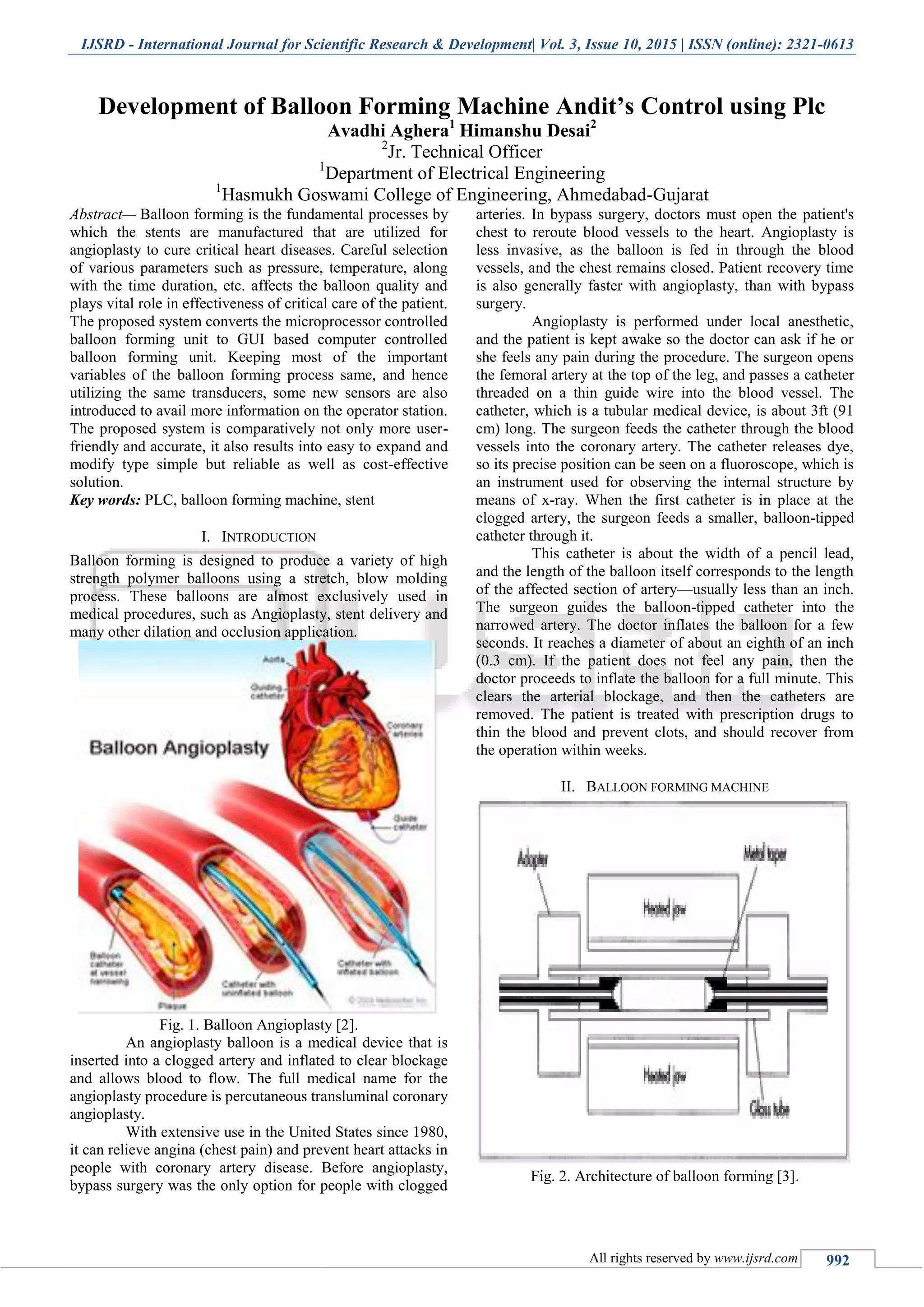 The document discusses the development of a balloon forming machine that uses PLC for better control in the manufacturing of balloons used in angioplasty procedures. It highlights the importance of parameters such as pressure and temperature in the quality of balloons, presenting a GUI-based computer-controlled system as an upgrade over traditional microprocessor controls. The proposed system is designed to be more user-friendly, accurate, and cost-effective, with the potential for future enhancements such as wireless monitoring and additional functionalities.