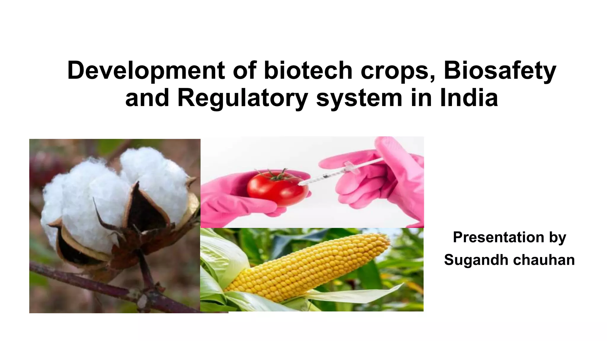 The document discusses the development, biosafety, and regulatory systems of genetically modified (GM) crops in India, highlighting the process of genetic modification, the rise of GM crop areas globally, and the various GM crops like Bt-cotton, Bt-brinjal, and Golden Rice. It outlines the methods of gene transfer and the historical context of Bacillus thuringiensis (Bt) as an important component in pest resistance in crops. The importance of biosafety and regulatory frameworks in India for the approval and monitoring of GM crops is also emphasized.