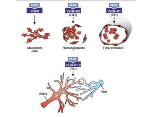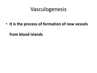 The document describes the process of vasculogenesis and angiogenesis in embryonic development. Vasculogenesis is the formation of new blood vessels from mesodermal blood islands, involving the differentiation of hemangioblasts into endothelial cells and blood cells. Angiogenesis is the formation of new vessels from existing ones. It also discusses the development of the heart, including the formation of the atrial and ventricular septa by fusion of endocardial cushions. The fetal circulatory system is described, which involves blood shunting from the right atrium to left via the foramen ovale and ductus venosus/arteriosus, allowing most blood to bypass the lungs. After birth, these fetal circulatory