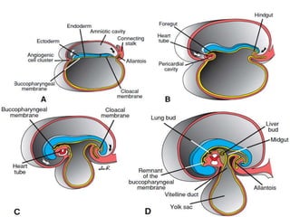 The digestive system develops between weeks 4-8 of gestation from the endoderm and surrounding mesoderm. The primitive gut forms and divides into the foregut, midgut, and hindgut. The foregut develops into parts of the pharynx, esophagus, stomach, duodenum, pancreas, and liver. The midgut rotates and returns to the abdomen, forming parts of the small and large intestine. The hindgut develops into parts of the large intestine and rectum. Errors during development can result in congenital abnormalities such as esophageal atresia, intestinal malrotations, and annular pancreas.