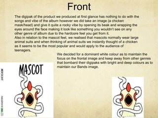 The document summarizes the design choices made for the digipak of a rock album. On the front, a chicken mask image was chosen and given a "rocky vibe" to represent the album's genre in an unconventional way. A dominant white color scheme was used to focus on the image while avoiding bright colors of other genres. On the back, song titles and standard information is displayed continuing the colorless aesthetic. An inside panel thanks those involved, and another features the lead singer to identify him as important, in line with music marketing theories. However, the final panel shows the full band, going against the theory of solely featuring the frontman.