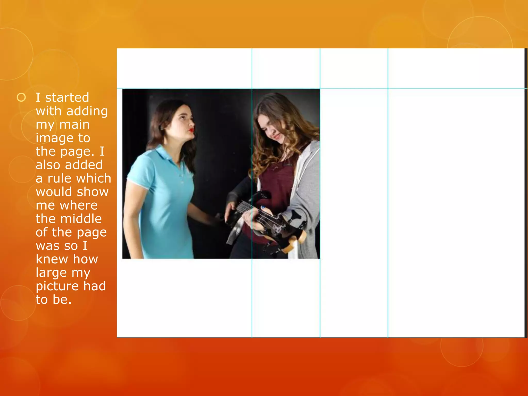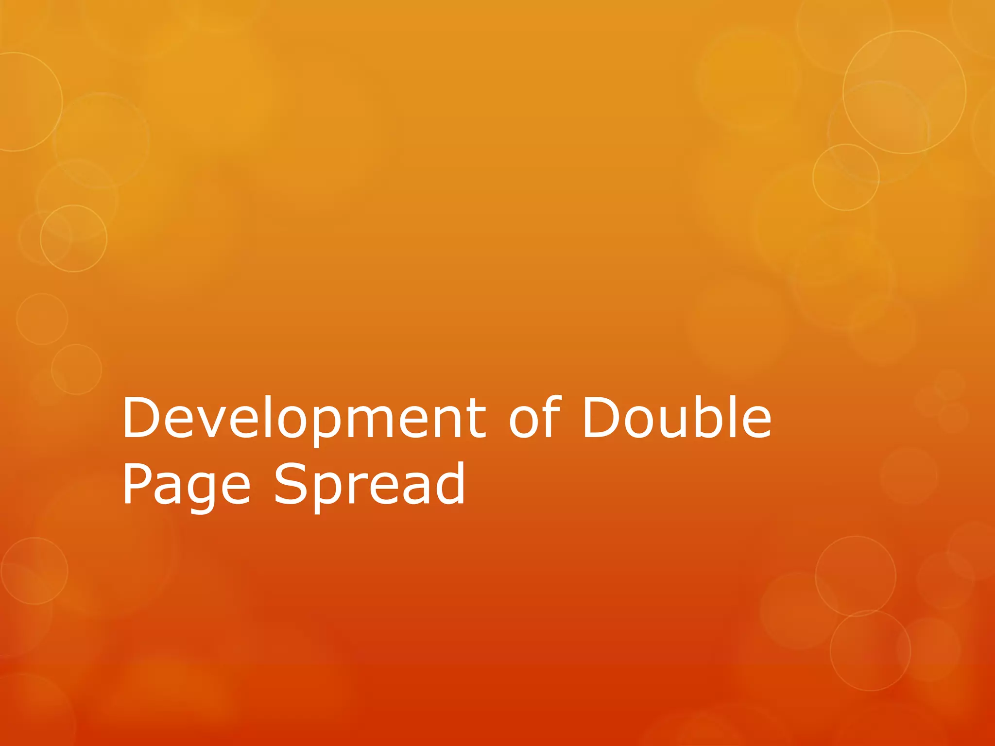 The document describes the steps taken to develop a double page magazine spread. It details adding a main image centered on the page with a rule to indicate the middle. Additional images were added in a montage style on the right page. Text was placed below with a drop cap kicker in an interview format. Colors and fonts were used consistently between elements. A sidebar and pull quotes were later added, along with page numbers and captions to complete the spread.
