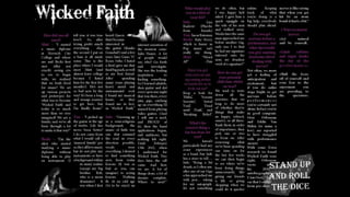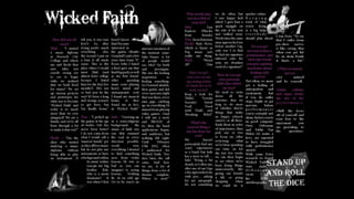 The document describes the process of developing a double page spread layout. The author scanned in a drawing but had to adjust it by removing shadows and inverting it for better quality. They initially did not like the layout as it did not fit the rock theme. Through rearrangement of images and text, making images more transparent, and adding inverted text, the layout improved. Interviews were added in Word. Images of band members were inserted which shifted the text around until a final design was reached.
