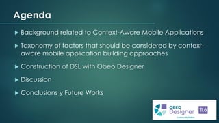 The document discusses the development of a domain-specific language (DSL) for creating context-aware mobile applications, outlining the complexity and challenges in this field. It presents a taxonomy of factors for application development, differentiating between non-expert and expert approaches, and highlights the limitations of existing tools. The conclusions indicate that the DSL has been constructed and tested for both indoor and outdoor applications, with plans for future enhancements and testing methodologies.