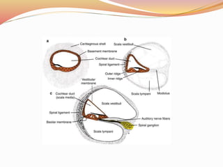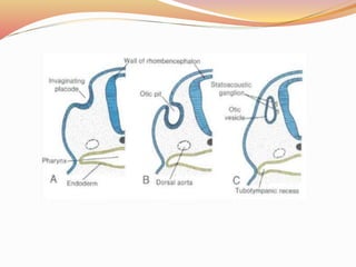 The document provides an overview of the embryonic development of the ear, detailing the formation of the external, middle, and inner ear structures. It covers the differentiation of components such as the cochlea, semicircular canals, and the tympanic cavity, as well as the role of sensory cells in hearing and equilibrium. Additionally, it discusses common developmental abnormalities, including congenital deafness and external ear defects.