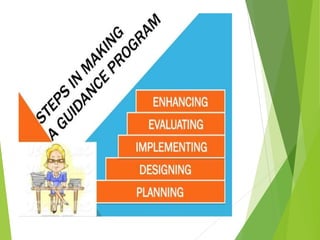 The document outlines a comprehensive educational guidance program aimed at helping students understand their behaviors, abilities, and potential paths. It details the planning and implementation of the program, including needs assessment, program goals, resource allocation, and evaluation methods. Effective implementation strategies are emphasized as crucial for the program's success.