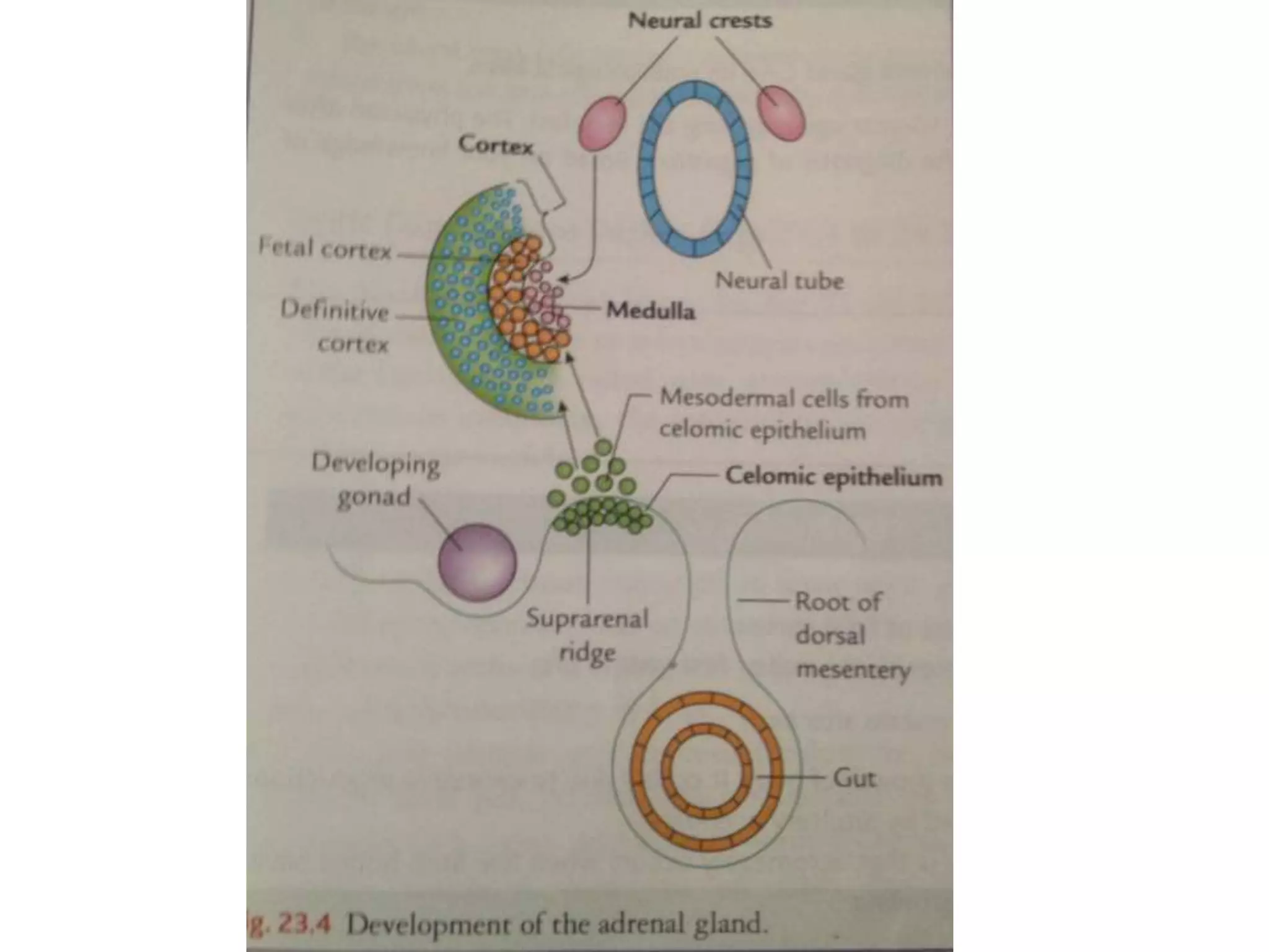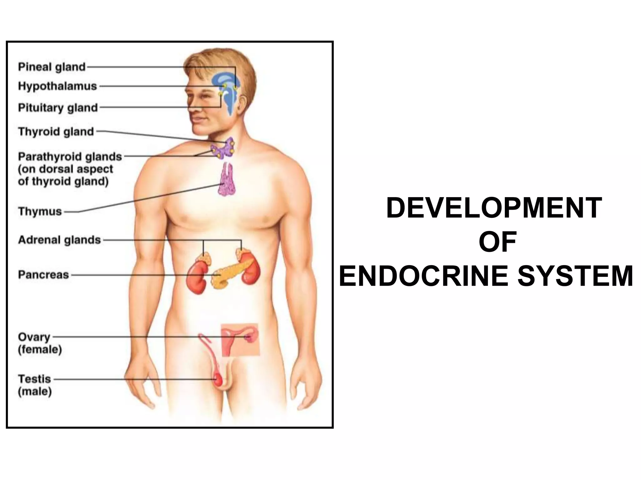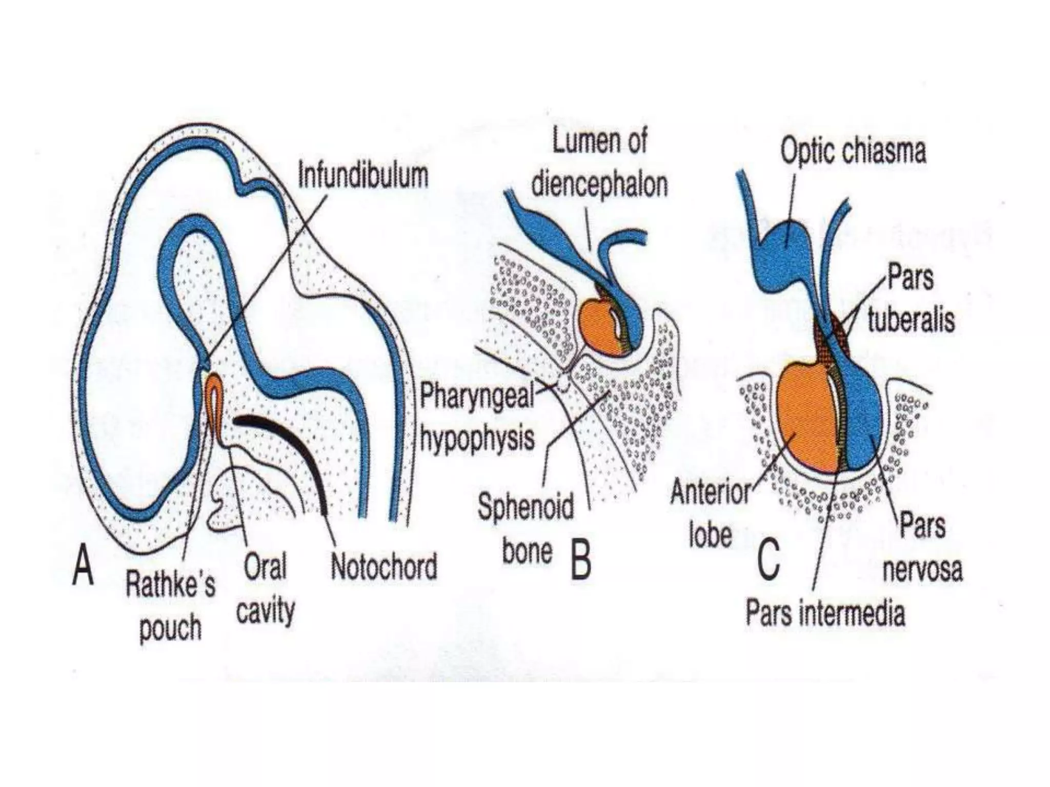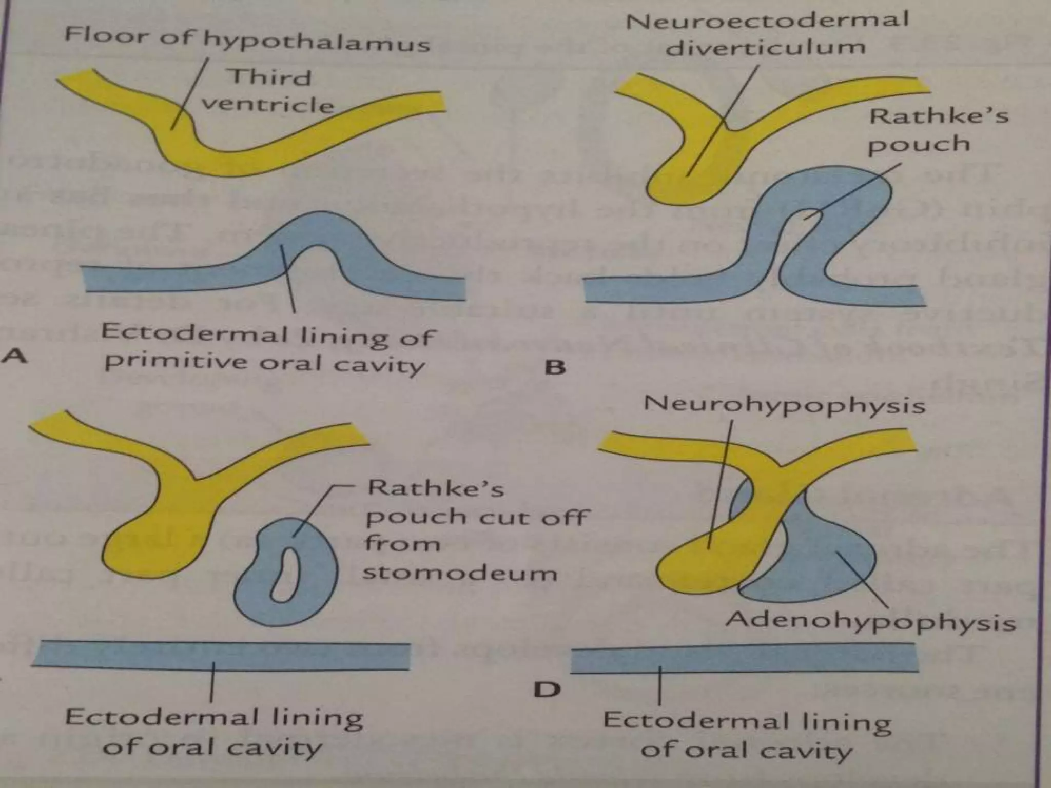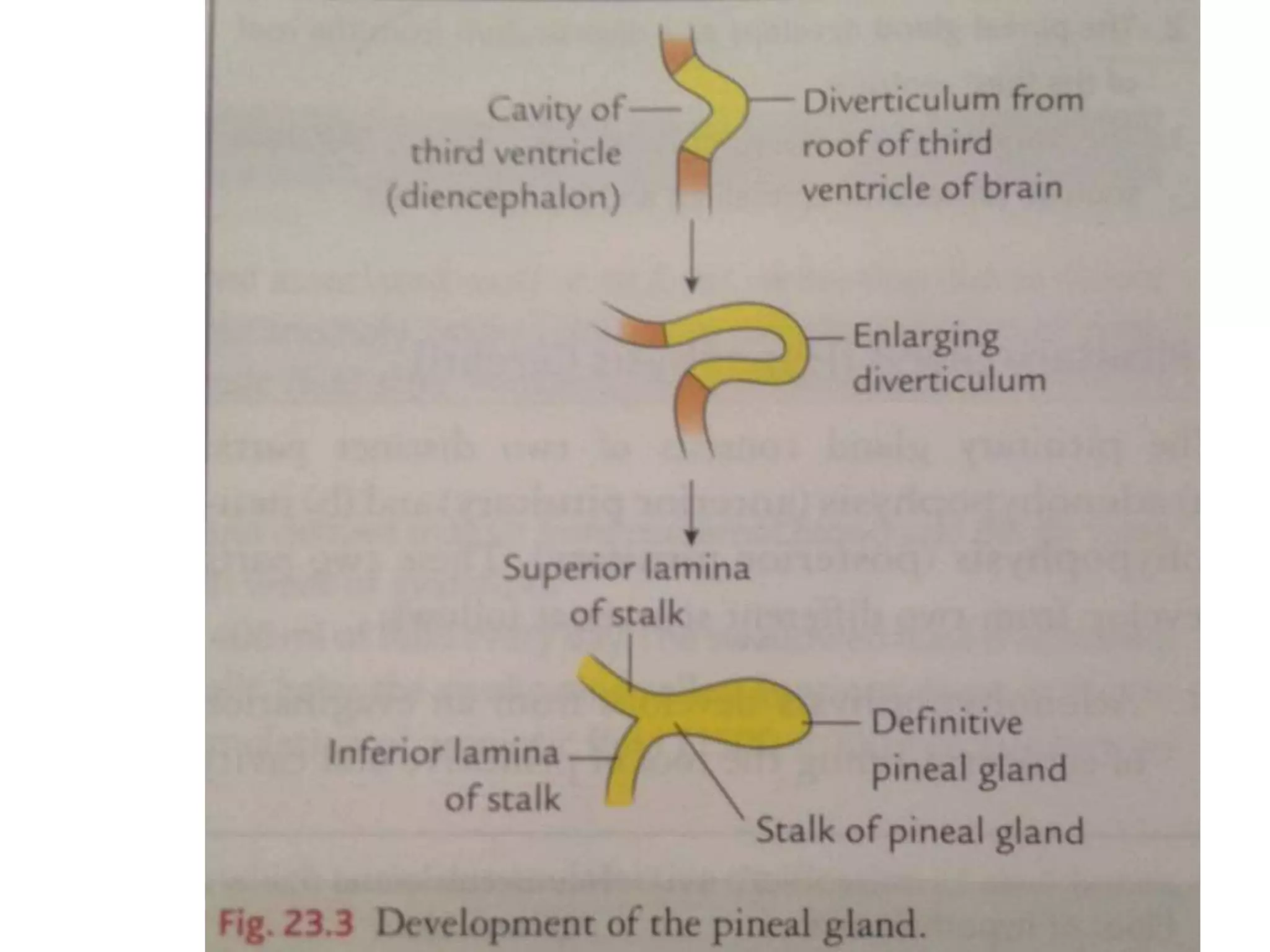 The pituitary gland develops from an evagination of ectoderm called Rathke's pouch and a neuroectodermal diverticulum from the hypothalamus. The anterior pituitary develops from Rathke's pouch while the posterior pituitary develops from the diverticulum. Possible anomalies include ectopic posterior pituitary, pharyngeal hypophysis, agenesis of the pituitary gland, duplication, and craniopharyngioma tumor. The pineal gland develops from a diverticulum of the diencephalon. The adrenal glands develop from coelomic epithelium for the cortex and neural crest cells for the medulla. The thyroid gland is the first endocrine gland to develop
