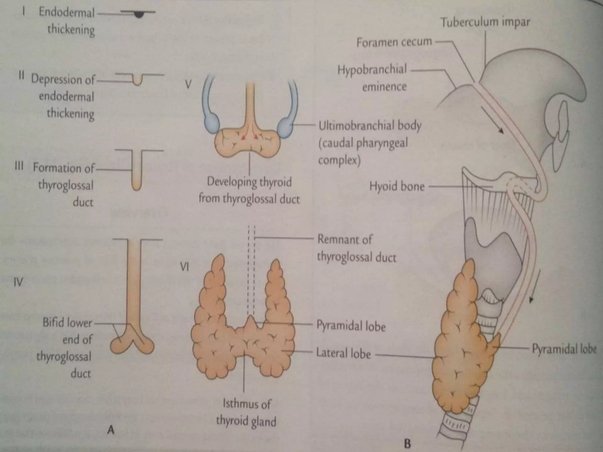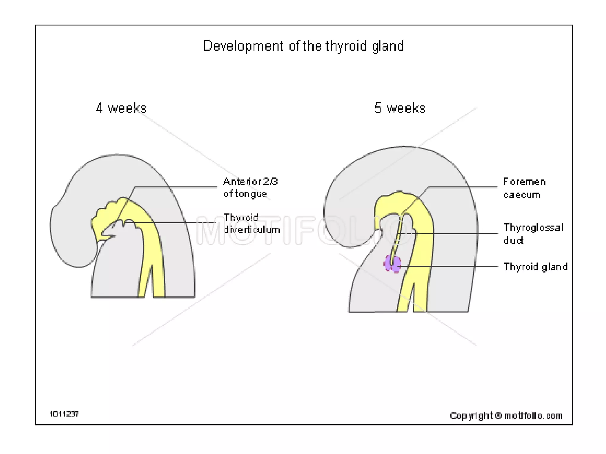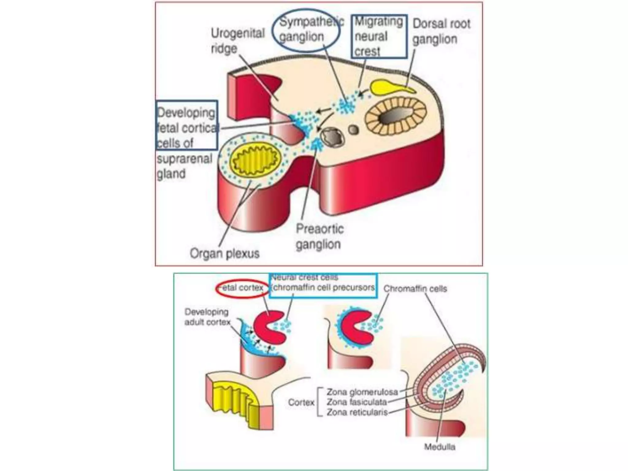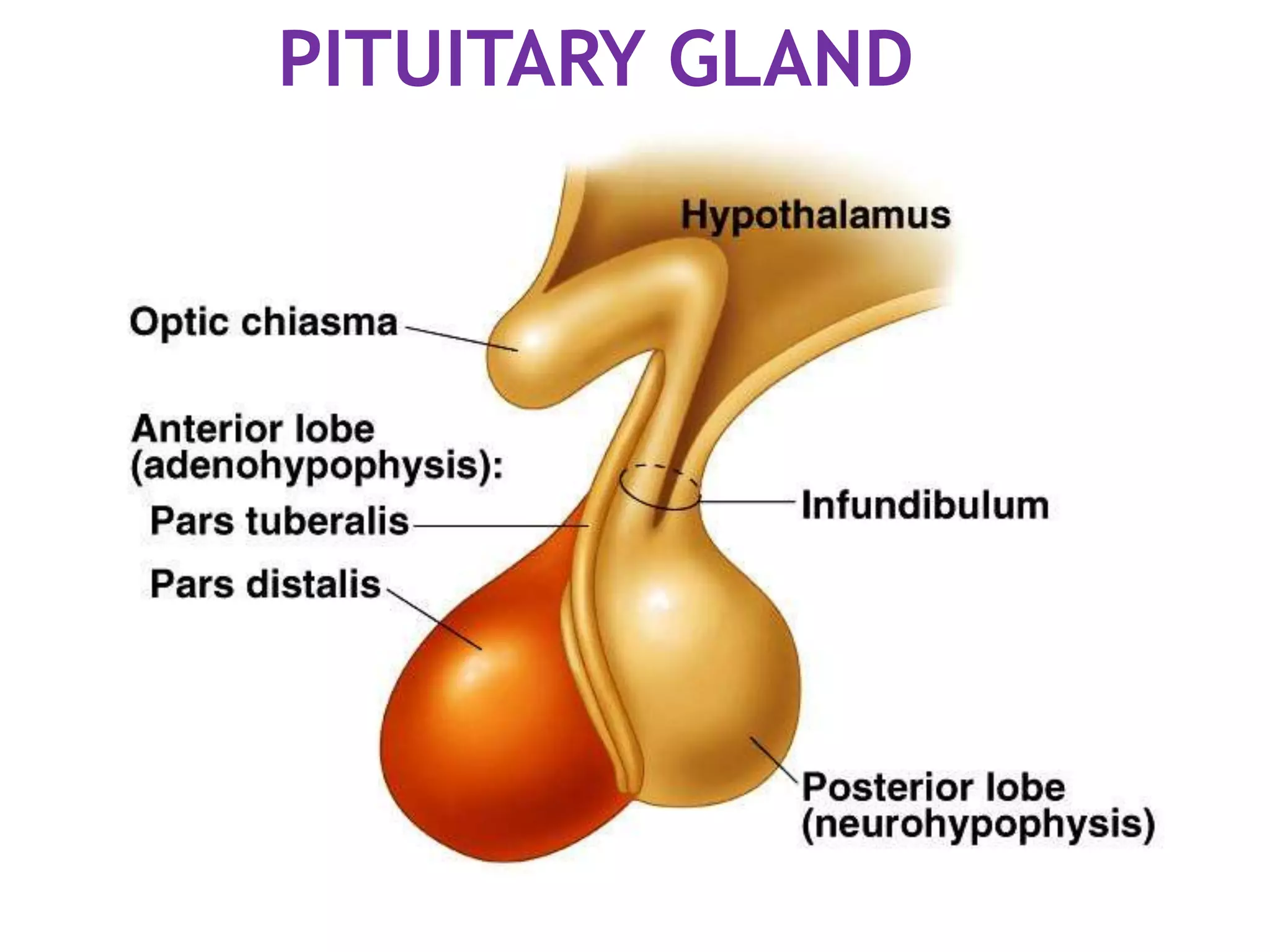 The pituitary gland develops from an evagination of ectoderm called Rathke's pouch and a neuroectodermal diverticulum from the hypothalamus. The anterior pituitary develops from Rathke's pouch while the posterior pituitary develops from the diverticulum. Possible anomalies include ectopic posterior pituitary, pharyngeal hypophysis, agenesis of the pituitary gland, duplication, and craniopharyngioma tumor. The pineal gland develops from a diverticulum of the diencephalon. The adrenal glands develop from coelomic epithelium for the cortex and neural crest cells for the medulla. The thyroid gland is the first endocrine gland to develop